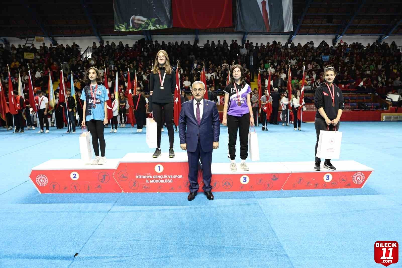 Yıldız kızlarda 1.’lik ve 2.’lik kürsüsünü alan Kütahya Belediyespor Kulübü sporcuları, 29 Ekim Cumhuriyet Bayramı kutlamalarında ödüllerini Kütahya Belediye Başkanı Prof. Dr. Alim Işık’tan aldı. – İHA