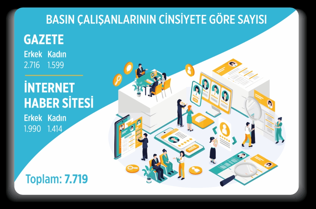 Gazete ve internet haber sitelerinde çalışan 7.719 basın çalışanının 3.013’ünü kadınlar oluşturdu. Gazetelerde 1.599’u kadın ve 2.716’sı da erkek olmak üzere toplam 4.315, internet haber sitelerinde ise 1.414’ü kadın 1.990’ı da erkek olmak üzere toplam 3.404 basın çalışanı istihdam edildi.