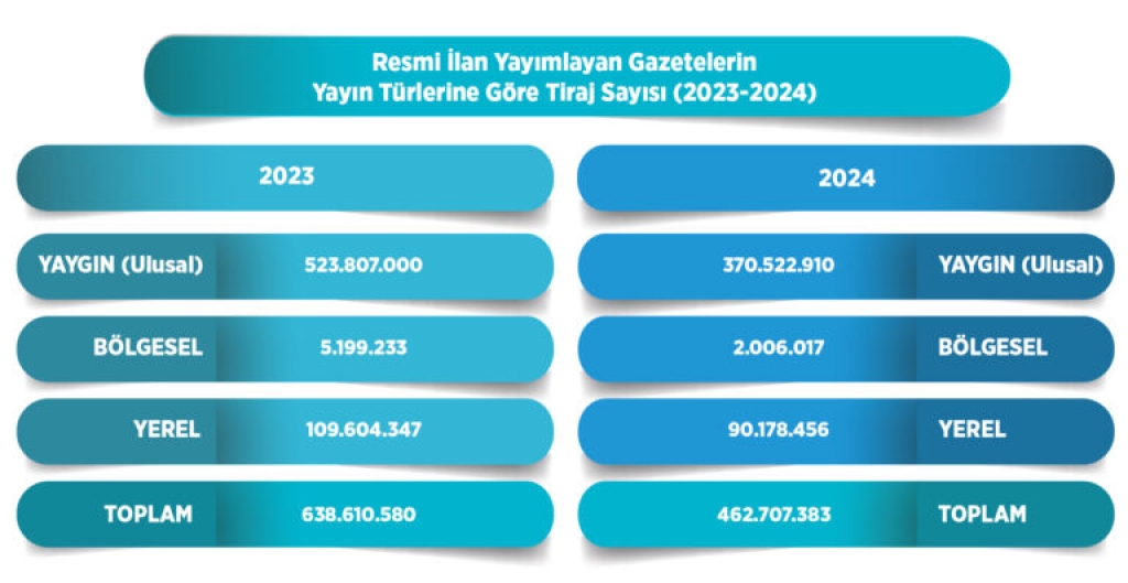 Gazetelerin toplam tirajı 2023 yılına göre yüzde 27,5 oranında düşüş göstererek 2024 yılında 462.707.383 olarak gerçekleşti.