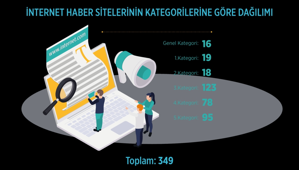 349 İnternet haber sitesinin yüzde 4,6’sı Genel Kategori, yüzde 5,4’ü 1. Kategori, yüzde 5,2’si 2. Kategori, yüzde 35,2’si 3. Kategori, yüzde 22,4’ü 4. Kategori, yüzde 27,2’si de 5. Kategori’de yer aldı.