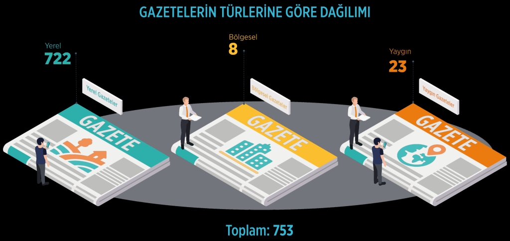 753 gazetenin yüzde 95,9’i yerel, yüzde 3’ü yaygın, yüzde 1,1’i ise bölgesel yayınlardan oluştu. Gazetelerin yayımlanma sıklığına bakıldığında ise 456’sının günlük, 297’sinin ise haftada 2 ila 6 gün arasında değişen periyotlarla yayımlandığı istatistiklere yansıdı.