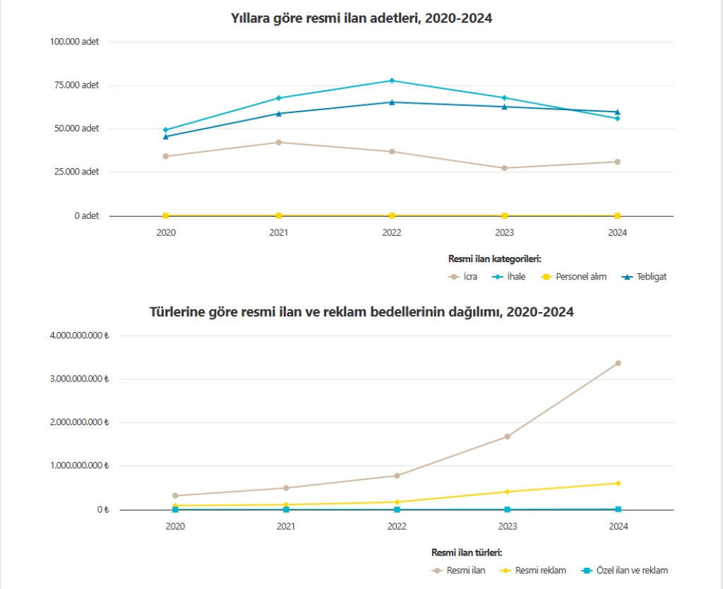 2024 yılında yayımlanan resmî ilan ve reklamların bedeli 2023 yılına göre yüzde 90 oranında artarak toplam 3.985.113.210 Türk Lirası olarak gerçekleşti. Buna karşın 2023 yılında yayımlanan 158.221 adet ilan, yüzde 7,1 azalarak 2024 yılında 146.944 sayısına geriledi.