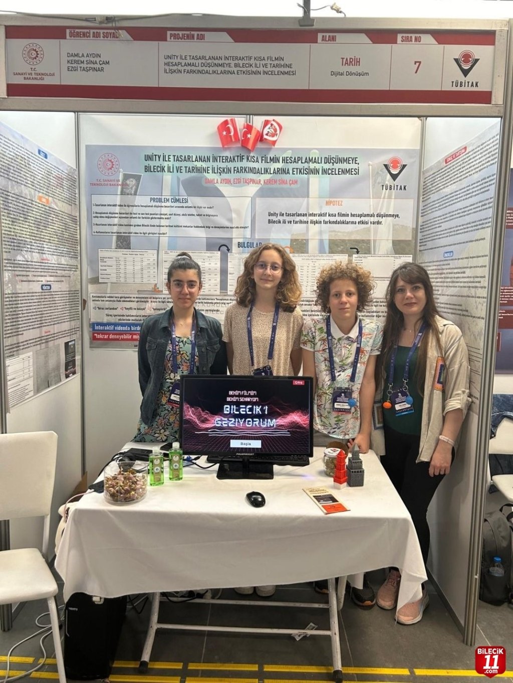 Bilecik Borsa İstanbul Bilim Sanat Merkezi’nden üç proje ekibi, araştırma ve bilimsel düşünme yeteneklerini sergiledi. ‘UNITY ile Tasarlanan İnteraktif Kısa Filmin Hesaplamalı Düşünmeye, Bilecik İli ve Tarihine İlişkin Farkındalıklarına Etkisinin İncelenmesi’ projesi ile Damla Aydın, Ezgi Taşpınar ve Kerem Sina Çam; öğrenme süreçlerine teknolojik ve interaktif bir yaklaşım getirdiler. Danışmanları Elif Serim’in rehberliğinde, Bilecik’in tarihi ve kültürel değerlerini dijital bir platformda işlediler.