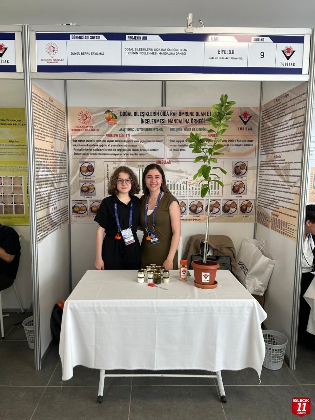 ‘Doğal Bileşiklerin Gıda Raf Ömrüne Olan Etkisinin İncelenmesi: Mandalina Örneği’ projesi ile Duygu Berru Eryılmaz ve danışman öğretmeni Kübra Bilik Demirel; mandalina gibi doğal bileşiklerin gıda koruma süreçlerindeki potansiyelini araştırdılar. Bu çalışma, gıda bilimi alanında yenilikçi bir katkı sundu.
