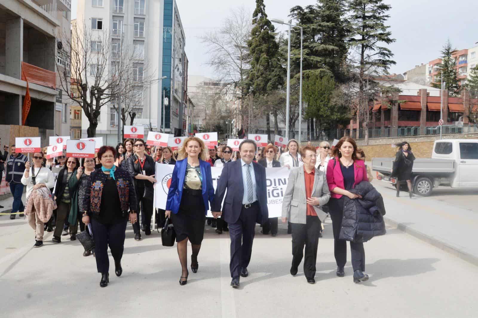 “1857 yılında Newyork’ta 40 bin dokuma işçisi,14 saatlik çalışma sürelerinin kısaltılması ve insanca yaşamaya yetecek b,r ücret için greve gittiler.Bu grev sırasında çıkan çatışma ve yangında,kadın ve çocuk 129 işçi can verdi. Birleşmiş Milletler,1977 yılında,bu günün anasına,8 Mart’ın Dünya Kadınlar Günü olarak kutlanmasına karar verdi. 8 Mart Dünya Kadınlar Günü, cinsiyet eşitsizliğine ve ayrımcılığa karşı,kadınların sosyal ve ekonomik sorunlarını haykırdığı,çözüm için birleşmenin zorunluluğunu vurguladığı bir gündür. 8 Mart,eşitlik ve haklar için mücadele eden kadının,toplumsal konumunun derlendirildiği,sorunların tartışıldığı ve yeni çözümlerin belirlendiği,uluslararası bir dayanışma günüdür. Bizler, toplumun diğer yarısını oluşturan kadınlar,her 8 Mart’ta,hayatın tüm alanlarında eşitliğin önündeki engelleri ortadan kaldırmak için birlik,umut ve mücadele kararlılığı ile bir araya gelmekte ve alanlarda olmaktayız.” ifadelerini kullandı.