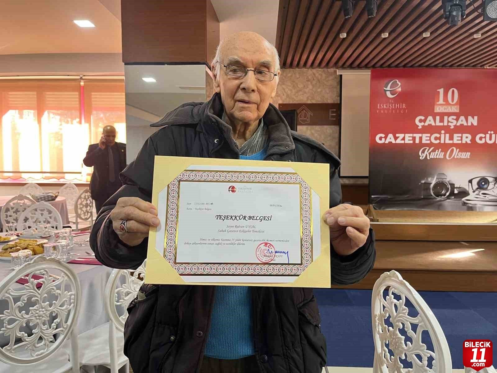 Eskişehir Valisi Hüseyin Aksoy, Gazeteciler Günü programında 91 yaşında olmasına rağmen 72 yıldır meslek hayatına devam eden, hala ilk günkü heyecanla gazeteciliğe devam ettiğini ifade eden Rıdvan Uysal’a teşekkür belgesi verildi.