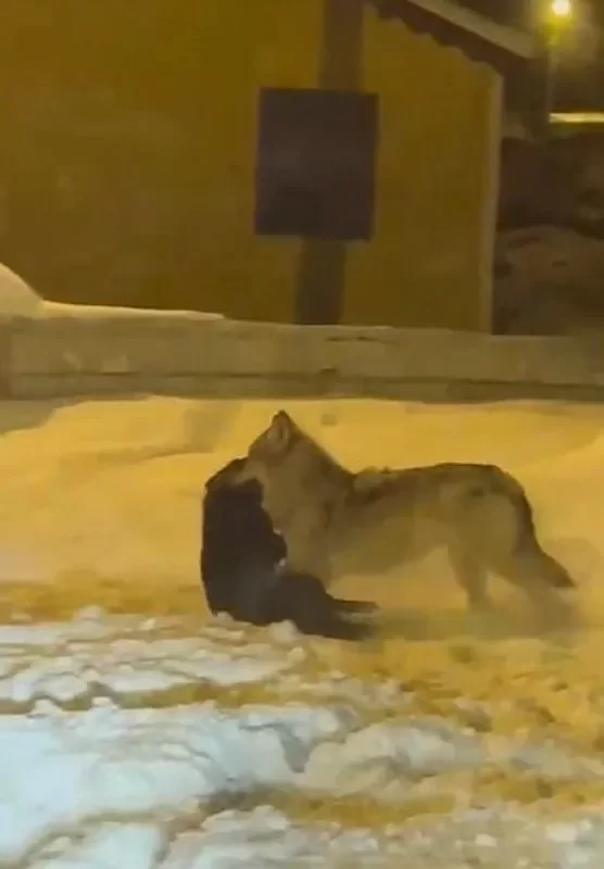 Ardahan’da kar yağışının ardından etkili olan dondurucu soğukların başlamasıyla birlikte kurtlar şehir merkezine indi. Aç kalan bir kurdun boğduğu köpeği sürükleyerek götürdüğü anlar ise cep telefonu kamerasınca kaydedildi.