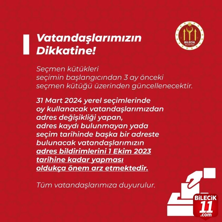 Bilecik Belediye Başkanlığı tarafından yerel seçimlerde oy kullanacak ve adres değişikliği yapacak vatandaşlara yönelik uyarı yapıldı.