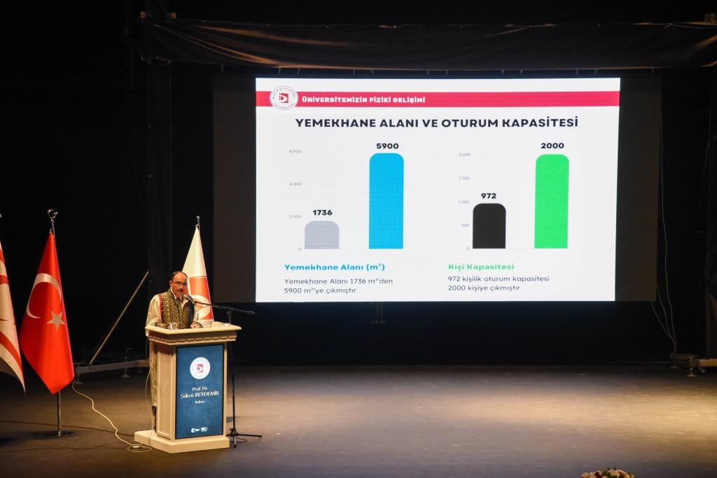 Üniversitede yapılan bilimsel, sosyal ve kültürel çalışmalara dair bir sunum yapan Rektör Beydemir, Üniversitemizin gerek yurt içi gerekse uluslararası düzeyde elde ettiği başarıları dinleyicilere aktardı. Web Of Science, Scopus, Times Higher Education (THE) gibi akademik ölçütlerin yanı sıra; Green Metric gibi sosyal ölçütlerde de Üniversitemizin geldiği noktaların altını çizen Rektörümüz Beydemir, “Bu başarılarda pay sahibi olan tüm paydaşlarımıza ve kıymetli mesai arkadaşlarıma şükranlarımı sunuyorum.” ifadelerini kullandı.