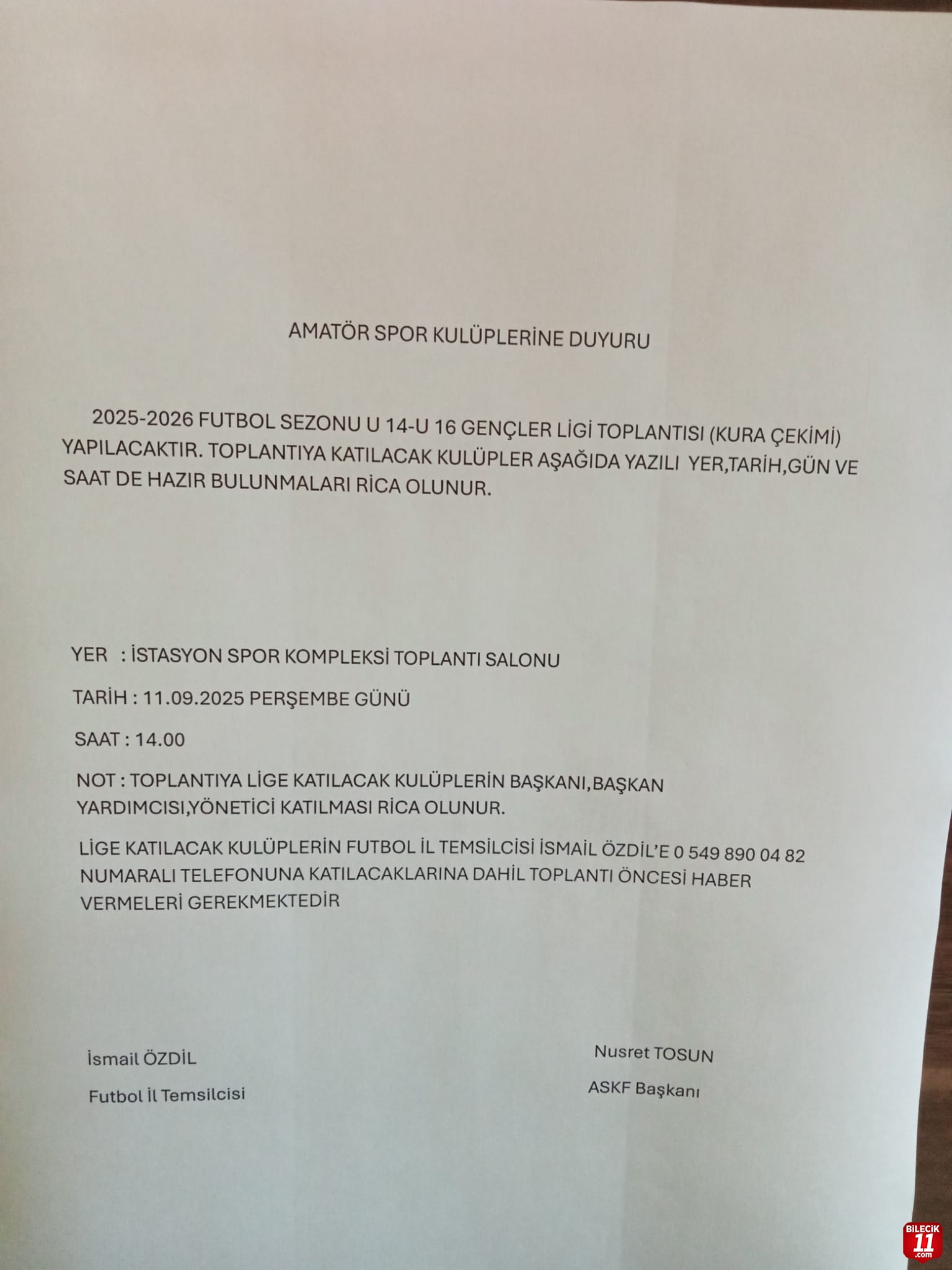 2025-2026 futbol sezonu U14-U16 Gençler Ligi kura çekim toplantısı 11 Eylül 2025 Perşembe günü saat 14.00’te İstasyon Spor Kompleksi Toplantı Salonu’nda gerçekleştirilecek.