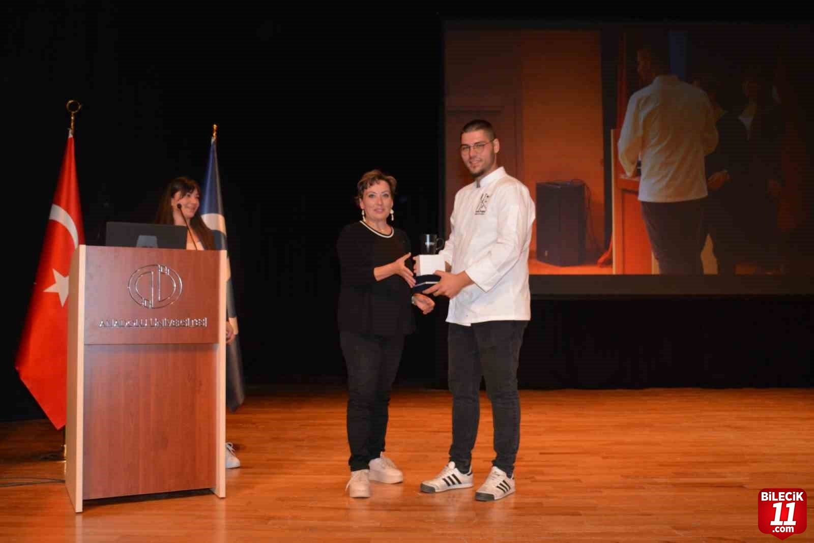 Atölyenin sonunda gerçekleştirilen çekiliş ile üç öğrenciye şef bıçağı hediye edilirken, Turizm Fakültesi Dekanı Prof. Dr. Semra Günay, Şef Sadık Doğan’a plaket takdim etti. – İHA