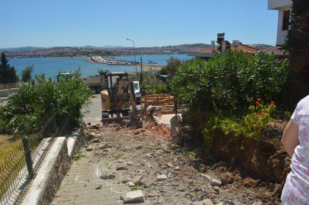 Ayvalık Belediyesi ekipleri, sokakların bir bölümüne duvar örülerek bahçe haline getirilen alanları yıktı.