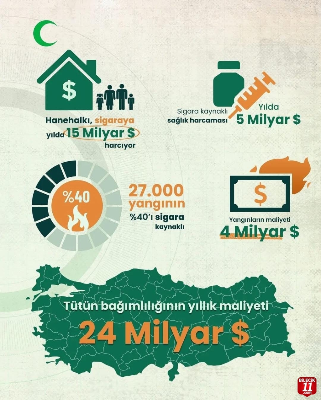 Yeşilay Bilecik, sigaranın faturasını yayımladı. Yeşilay tarafından yapılan açıklamada tütün bağımlılığının Türkiye’ye yıllık maliyetinin 24 milyar dolar olduğu ifade edildi. Sigaraya yılda 15 milyar dolar harcanırken, izmaritlerin yıllık atık hacminin 5 bin çöp kamyonu olduğu belirtildi. Yeşilay, sigaranın çevre kirliliğine etkisinin 10 yıl olduğunu vurgularken 27 bin yangının %40’ının sigara izmariti kaynaklı meydana geldiğini ifade etti. Yeşilay’ın yayımlamış olduğu açıklamada “Bir paket sigara, yalnızca sağlığınızı değil ekonomiyi de yakıyor. Bağımlılıklarla mücadele sadece bireysel değil, toplumsal ve ekonomik bir sorumluluktur.” ifadeleri yer aldı.