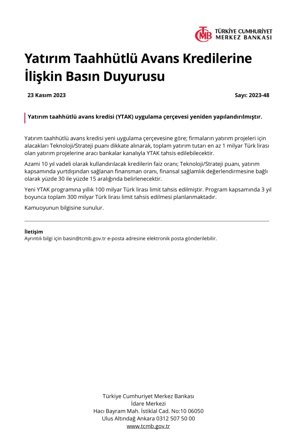 “Yatırım, İstihdam, Üretim, İhracat Merkez Bankası, teknolojik ve stratejik yatırımlara odaklanan, yıllık 100 milyar TL olmak üzere üç yılda 300 milyar TL limit tahsis edilmesi planlanan yeni Yatırım Taahhütlü Avans Kredisi Programını duyurdu.