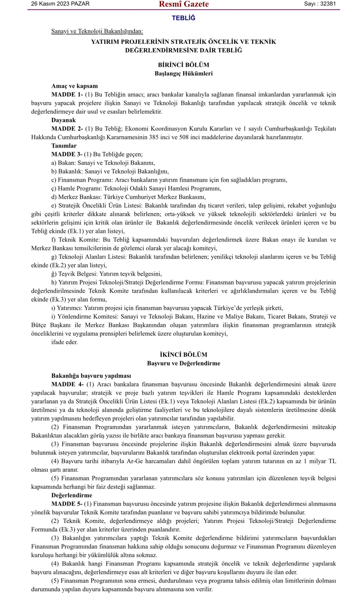 Türk ekonomisinin yatırım, üretim, istihdam ve ihracatına katkı sağlayacak olan stratejik öncelikli ürünler ile kapsama giren teknoloji alanları Sanayi ve Teknoloji Bakanlığı tarafından belirlenerek, bugünkü Resmî Gazetede yayımlandı.