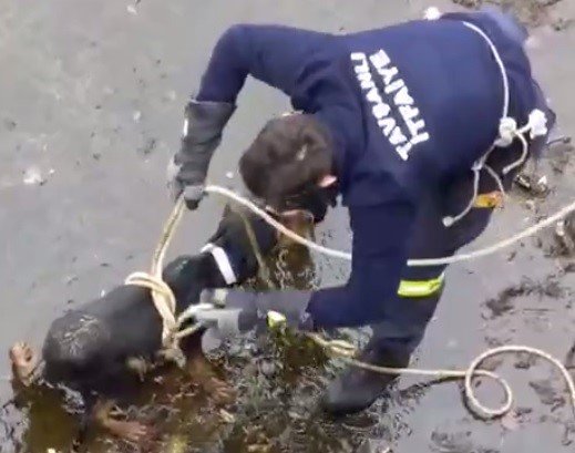 İtfaiye erleri avcı köpeğini halat bağlayarak bulunduğu yerden çıkardı. Kurtarılan köpek daha sonra doğal yaşam alanına salındı. – İHA