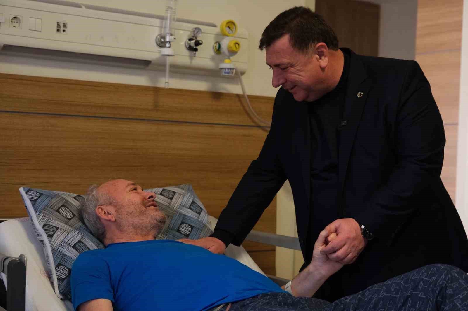 Şehir Hastanesi Müdürü Doç. Dr. Mustafa Sungur ile birlikte Şehir Hastanesi’nde tedavi gören hastaları ve hasta yakınlarını ziyaret eden Özkan Alp, geçmiş olsun dileklerini iletti. – İHA