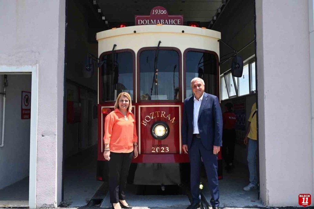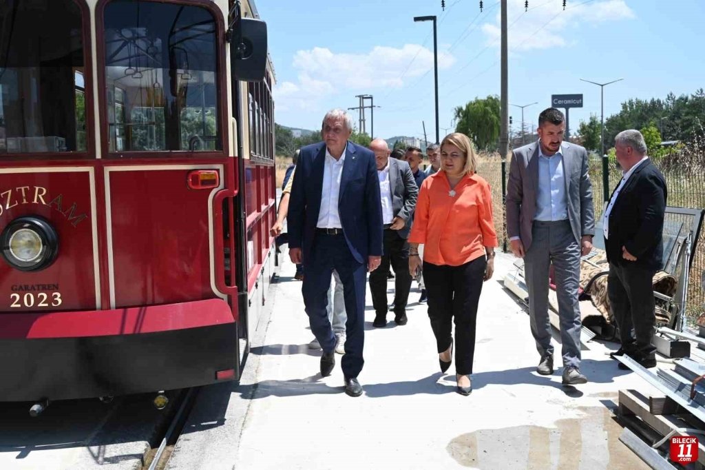 Başkan Bakkalcıoğlu daha sonra misafiri Başkan Hürriyet ve beraberindekilerle birlikte tramvaya binerek hangara gitti. Yol boyunca tramvayda, istasyonlarda ve hangarda incelemelerde bulunan Başkan Hürriyet, Başkan Bakkalcıoğlu’ndan proje hakkında detaylı bilgiler aldı. – İHA