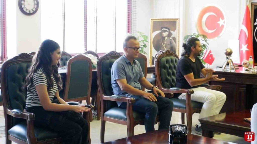 Başkan Bakkalcıoğlu tiyatro ekibi öğrencileri ve öğretmenleri Önder Gün, Aslı Yıldız ve Ramazan Savaş ile makamında bir süre görüşerek sohbet etti.