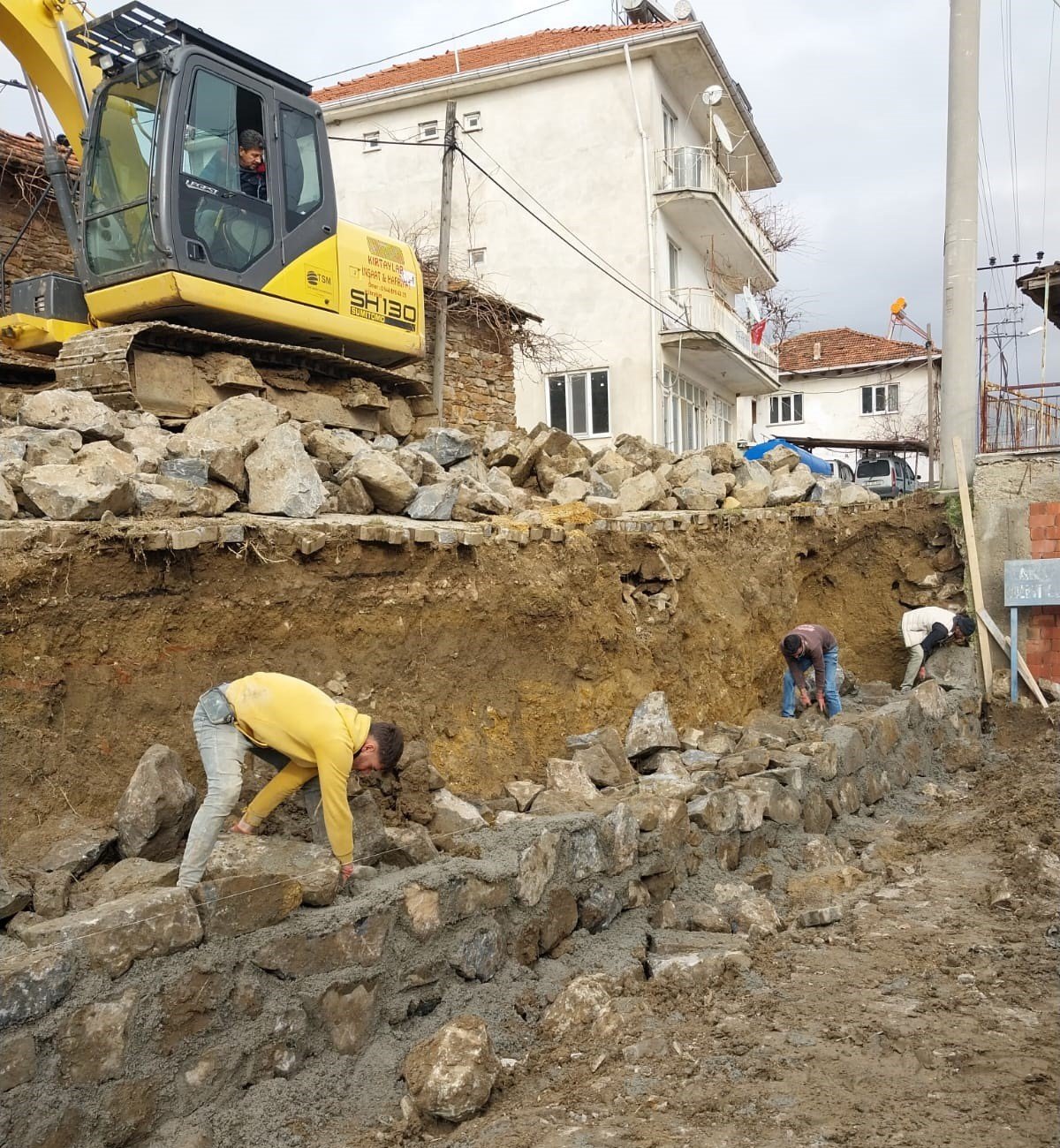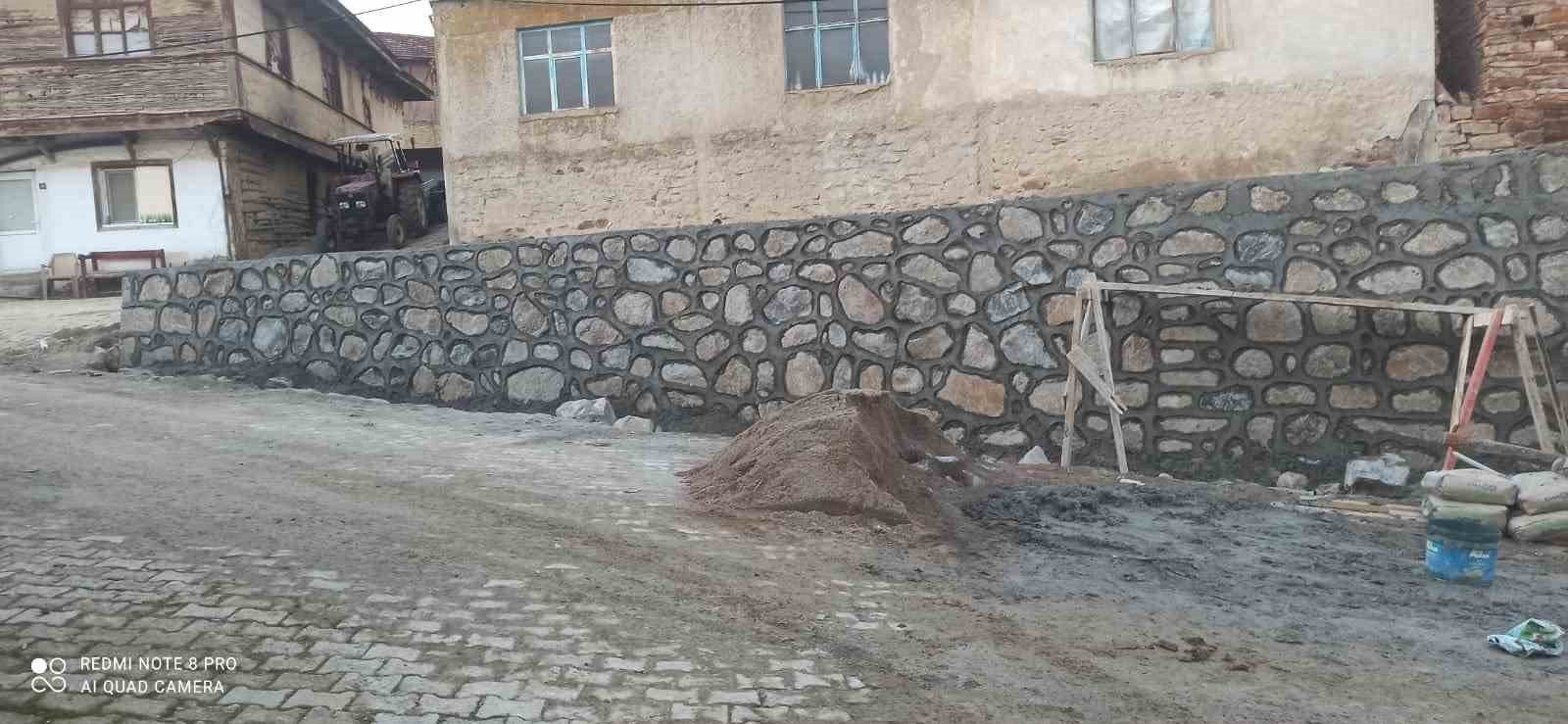 Kütahya’nın Pazarlar ilçesinin Yakuplar Mahallesinde yıkıma yüz tutmuş yol kenarındaki duvarlar yeniden yapılıyor.