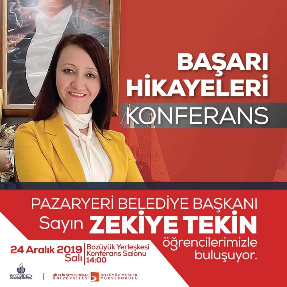 Pazaryeri Belediye Başkanı Zekiye Tekin, Bozüyük Girişimciliği Destekleme Derneği(BOZGİDED) ve Bozüyük MYO’nun işbirliği ile gerçekleştirilecek olan “Başarı Hikayeleri” konulu konferansa katılacak.