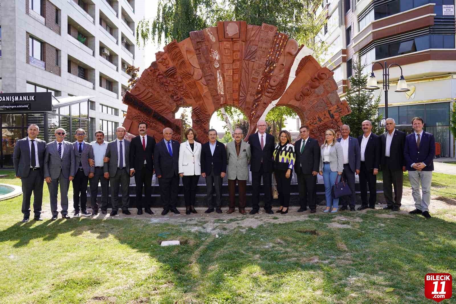 Belediye hizmet binasının ardından ise başkanlar, bu yıl 16’ncı kez düzenlenen Pişmiş Toprak Sempozyumu’nda 21 misafir sanatçı ve sempozyum komitesinin el ele emek vererek cumhuriyetin 100’üncü yıl anısına ortaya çıkan anıtı ziyaret etti. Başkanlar, ortaya çıkan eserin Eskişehir’e ve Türkiye’ye yakıştığını belirtti.