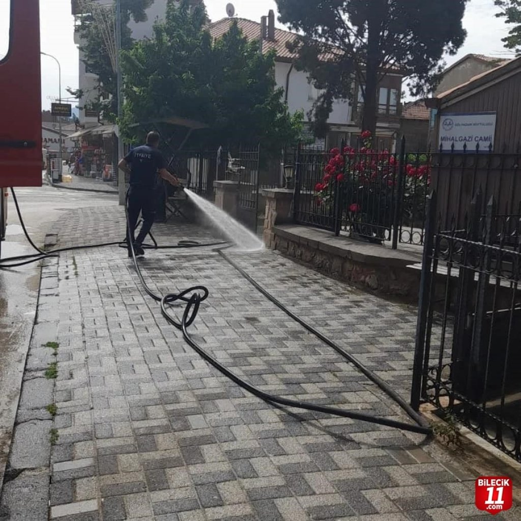 Gölpazarı’nda yapılan çalışmalarda; parklar ve kaldırımlar, camii bahçeleri, Horhorlar meydanı olmak üzere bol köpüklü sularla temizlendi.
