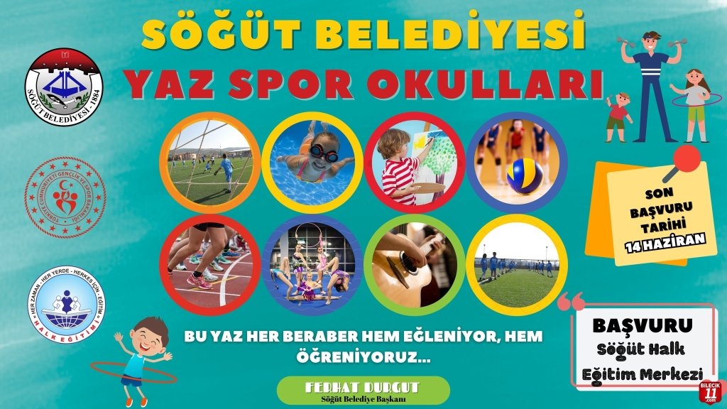 “Söğüt Belediyesi, İlçe Gençlik ve Spor Müdürlüğü ile Halk Eğitim Merkezi Müdürlüğü işbirliğiyle; Yüzme, Futbol, Voleybol , Basketbol, Akıl ve zeka oyunları, Güreş, Jimnastik, Masa tenisi, Kort tenisi, Atletizim, Resim, Gitar, Keman, Piyano, Baglama Branşlarında; 6-14 yaş arası tüm öğrencilerimiz kayıtlarını 10-14 Haziran tarihleri arasında ilçe Halk Eğitim Merkezi Müdürlüğüne yaptırabilirler. Kurslarımız 24 Haziran tarihinde başlayacaktır.”