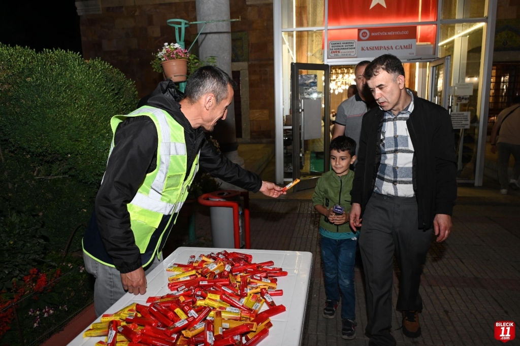Bozüyük’te Mevlid Kandili nedeniyle ibadetlerini camilerde yapan cemaate belediye personelleri tarafından mevlid şekeri ikram edildi. Yatsı namazının ardından yapılan şeker dağıtımı esnasında vatandaşların kandilini kutlayan görevliler vatandaşlara hayırlı kandiller dilediler.