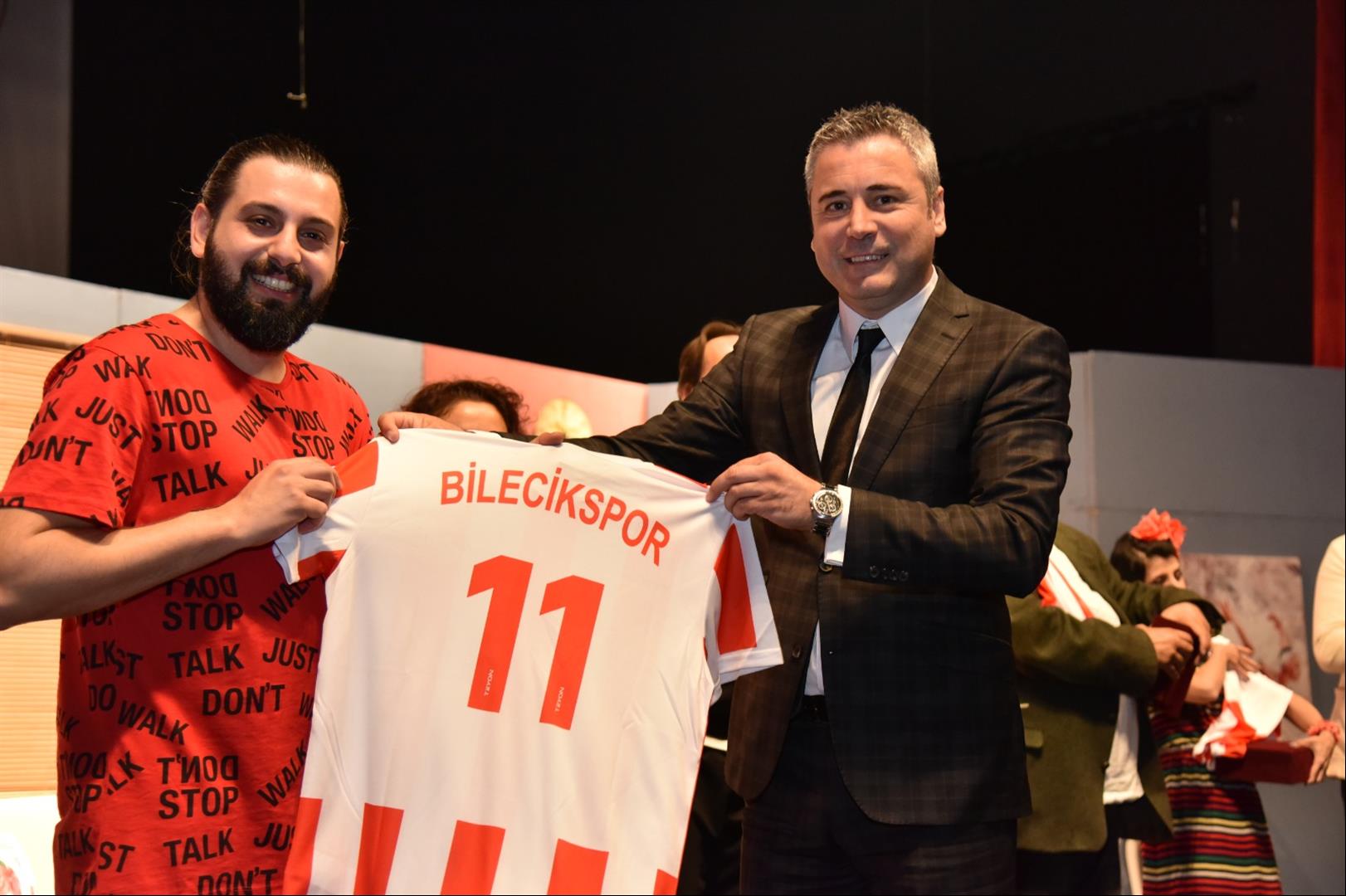 “Her bilet takıma bir destek” kampanyası ile iki perde olarak sahne alan oyun sonunda Belediye Başkan Vekili Semih Tuzak ve Bilecikspor Başkanı Aydın Avcı, oyunculara kahve fincanı takımı ile Bilecikspor forması hediye etti.