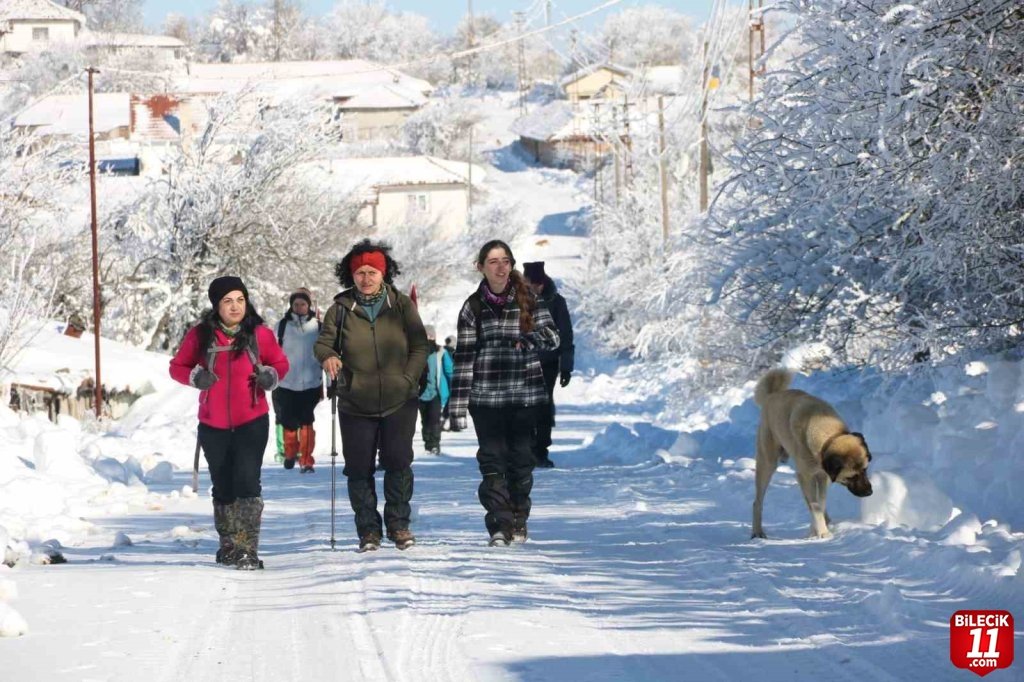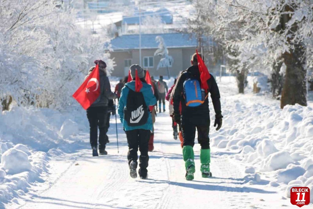 Yaklaşık yarım metreye yakın kar kalındığının bulunduğu bölgede 12 kilometrelik rotayı izleyen 18 kişilik ekip, yürüyüş sonunda saygı duruşu ve ardından İstiklal marşını hep birlikte söyleyerek yürüyüşlerini tamamladılar.
