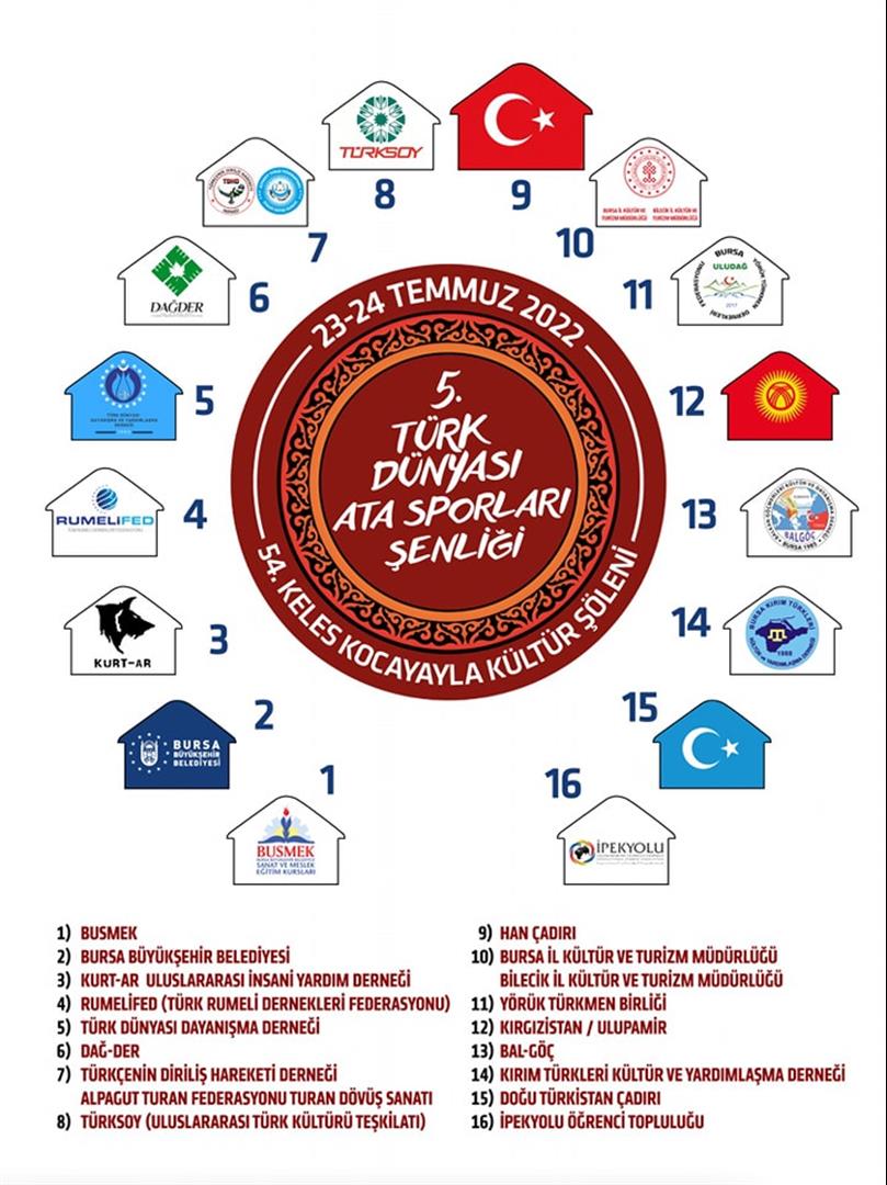 16 Türk Devletini temsil eden çadırların birisi olarak gelen misafirlerini şehrin zengin tarihinin kültürünün doğal güzelliklerinin anlatılacağı alanda ayrıca eylül ayında gerçekleşecek 741. Ertuğrul Gazi’yi Anma Yörük Şenlikleri ve bu yıl 100. Yılını idrak edilecek Bilecik’in Düşman İşgalinden Kurtuluşu Şenliklerine davet edilmesi planlanıyor.