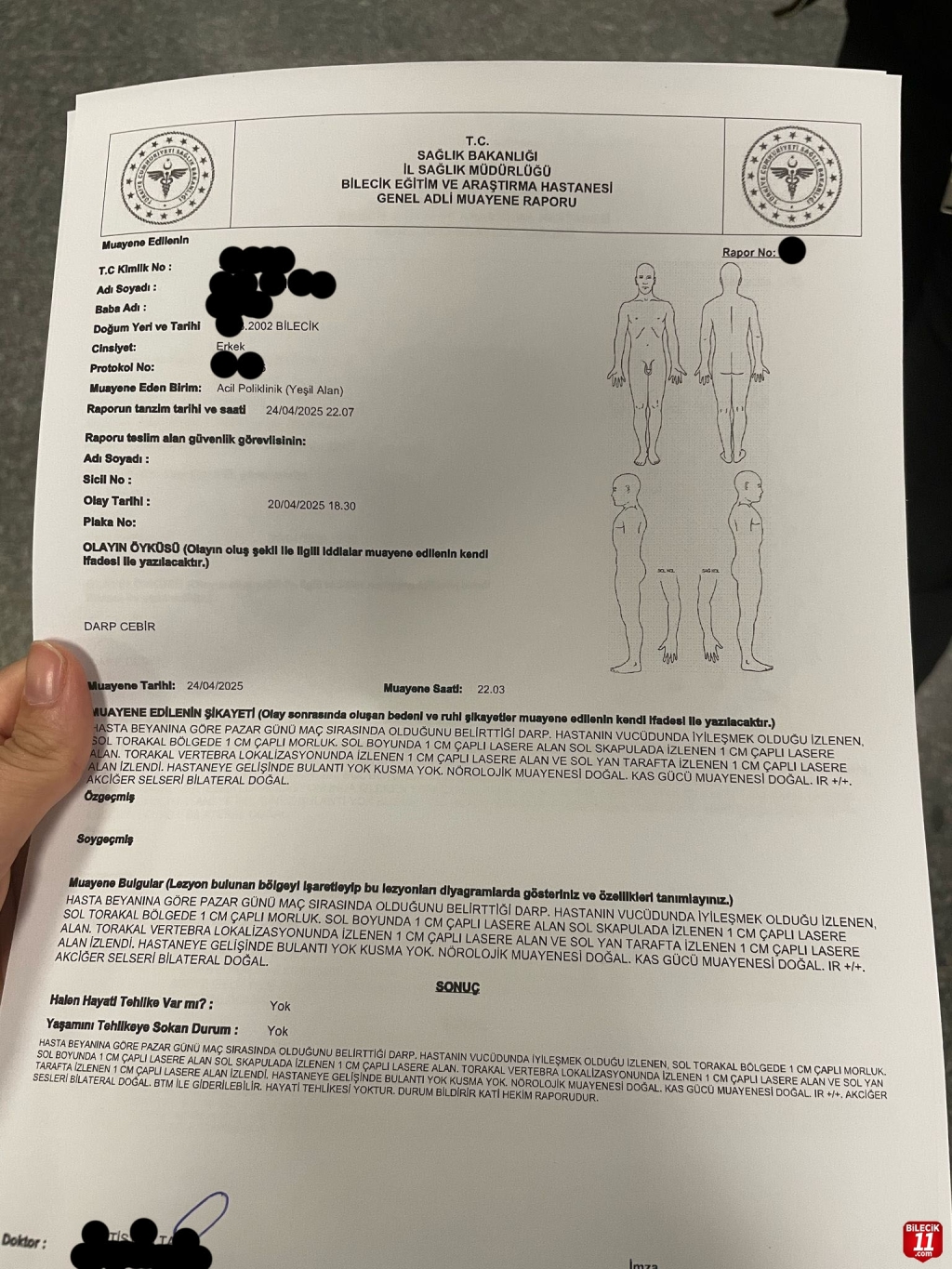 Edebalispor oyuncuları Y.E.D. ve H.D. vücutlarının çeşitli yerlerinden yaralanırken, H.D.’nin aldığı darp raporu acı gerçeği gözler önüne serdi. Boyun, sırt ve yan bölgesindeki morluk ve yırtılmalar adeta “Bu futbol değil” dedirtti. Darp edilen oyunculardan H.D. yasal süreci başlattı ve şikayetçi oldu.