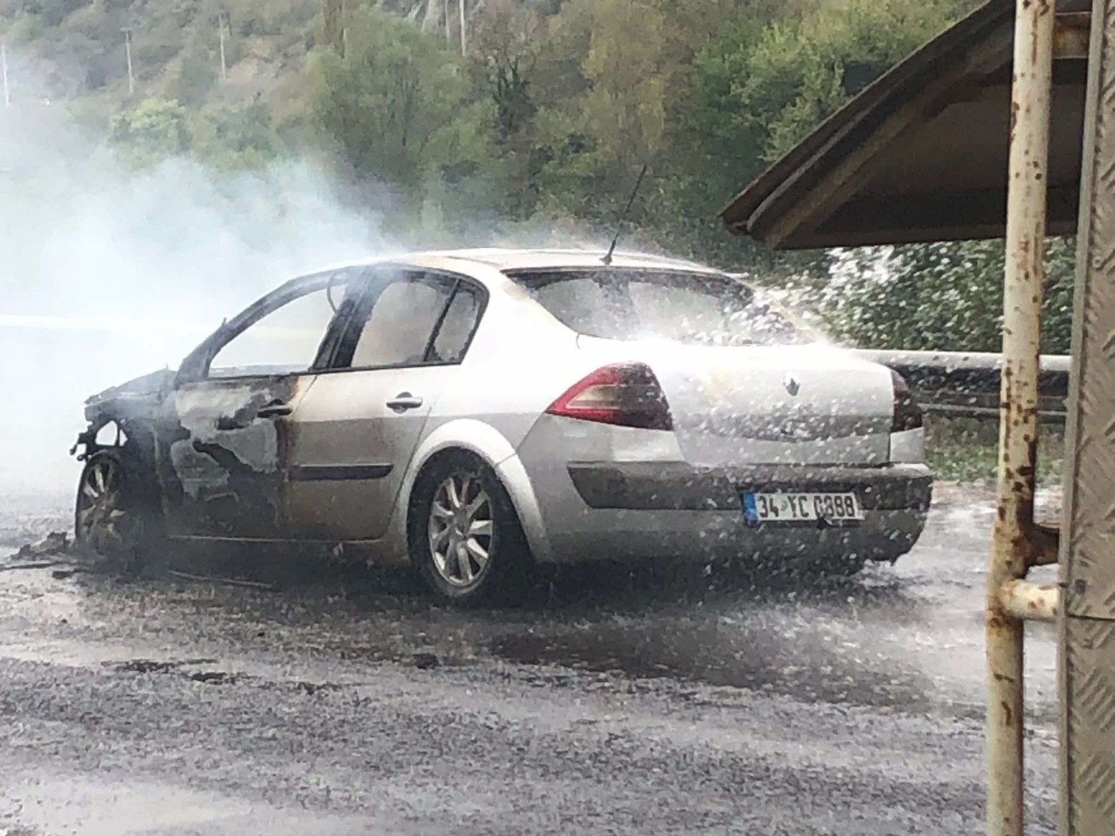 Yangını kontrol altına alan ekipler, soğutma çalışması yaptı. Otomobilin kullanılamaz hale geldiği yangının çıkış nedeni araştırılıyor.