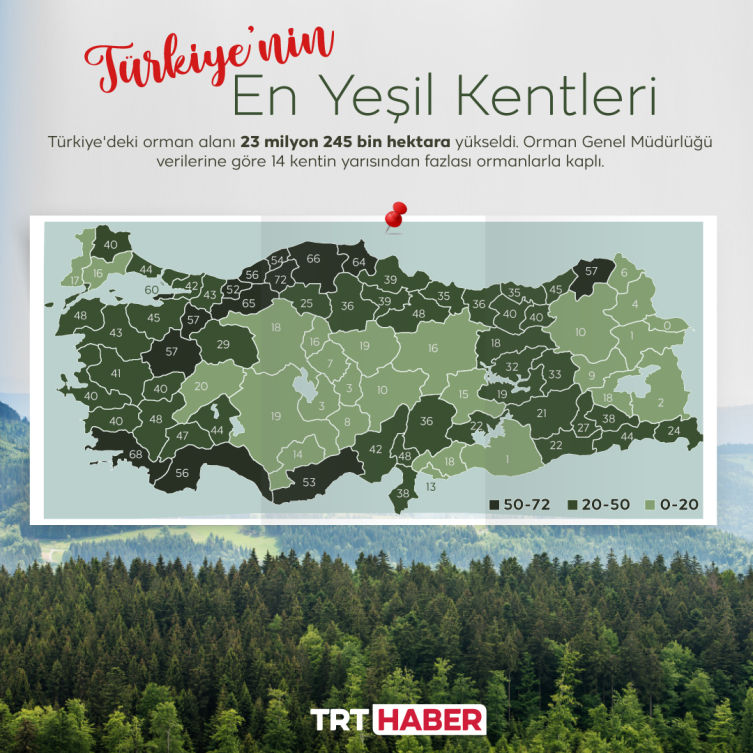 Türkiye’deki toplam orman alanı, 2023 yılında 23 milyon 245 bin hektar oldu. Yüz ölçümüne göre yüzde 72’si orman olan Karabük, kişi başına düşen 29 bin 426 metrekare orman alanı ile de Tunceli, ilk sırada yer alıyor.