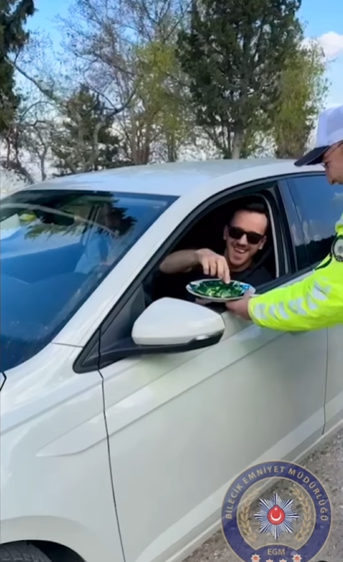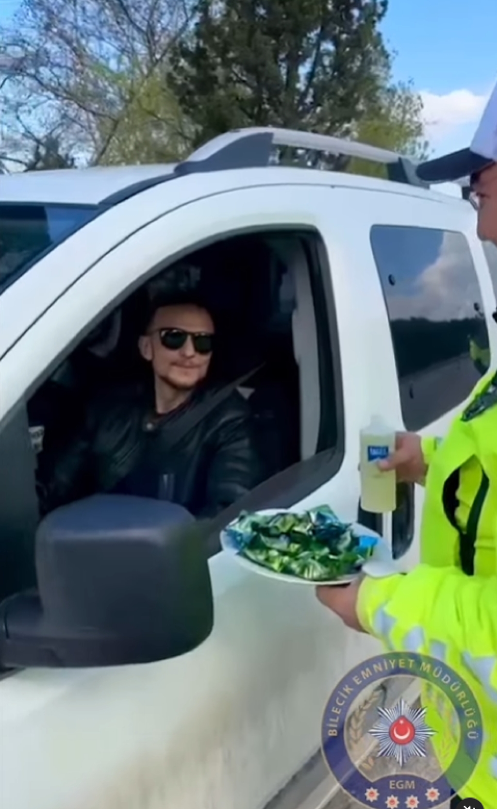 Bilecik’te trafik ekipleri Ramazan Bayramı dolayısıyla sürücülere çikolata ve kolonya ikram etti.