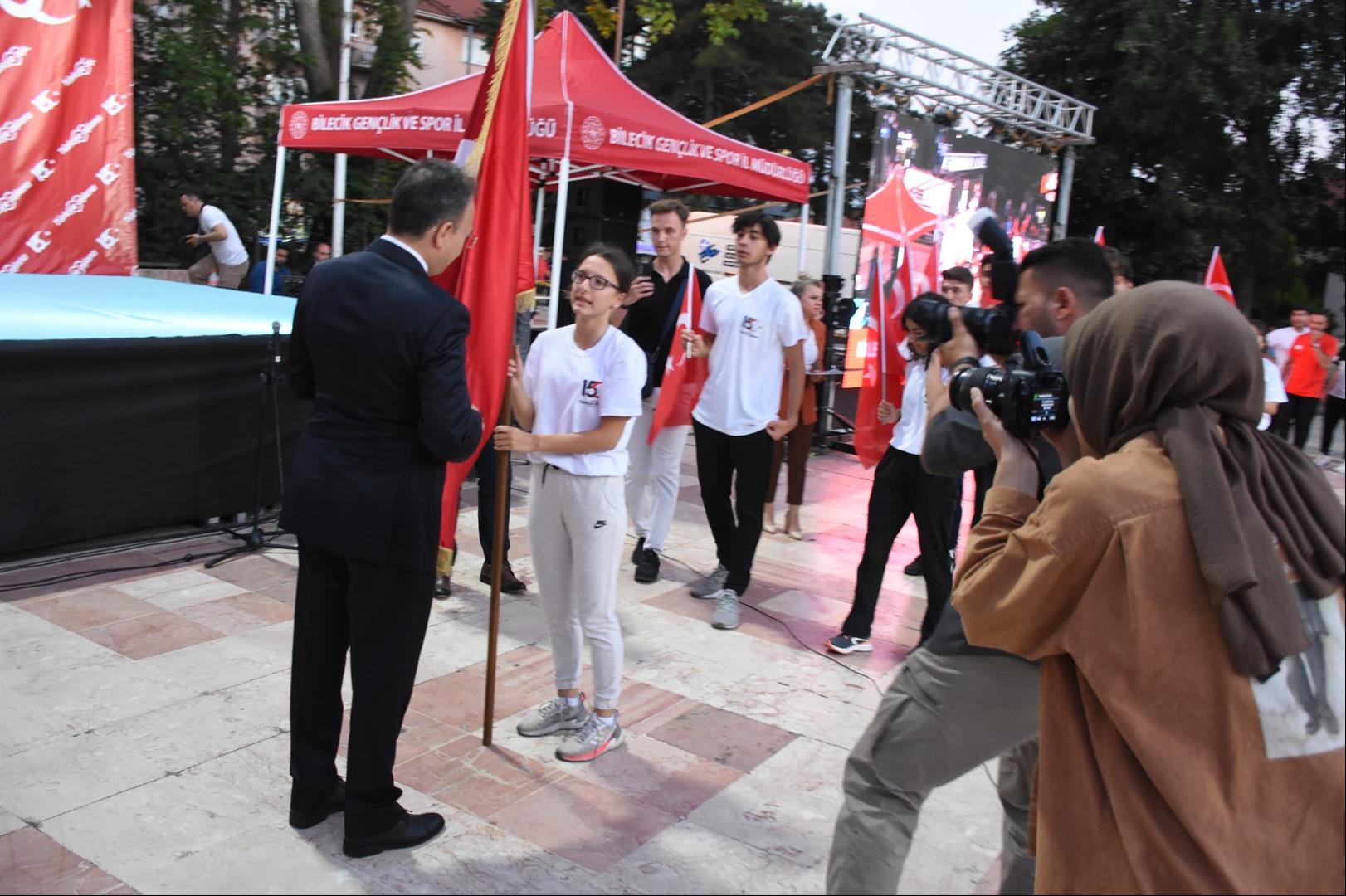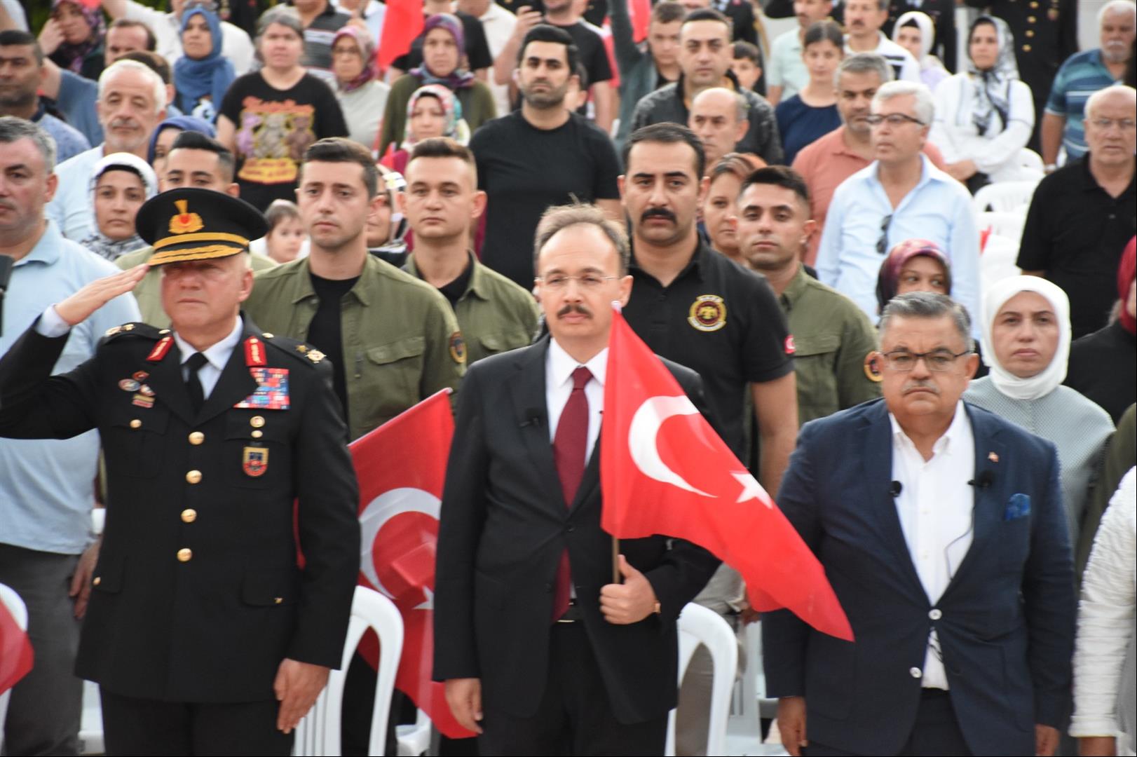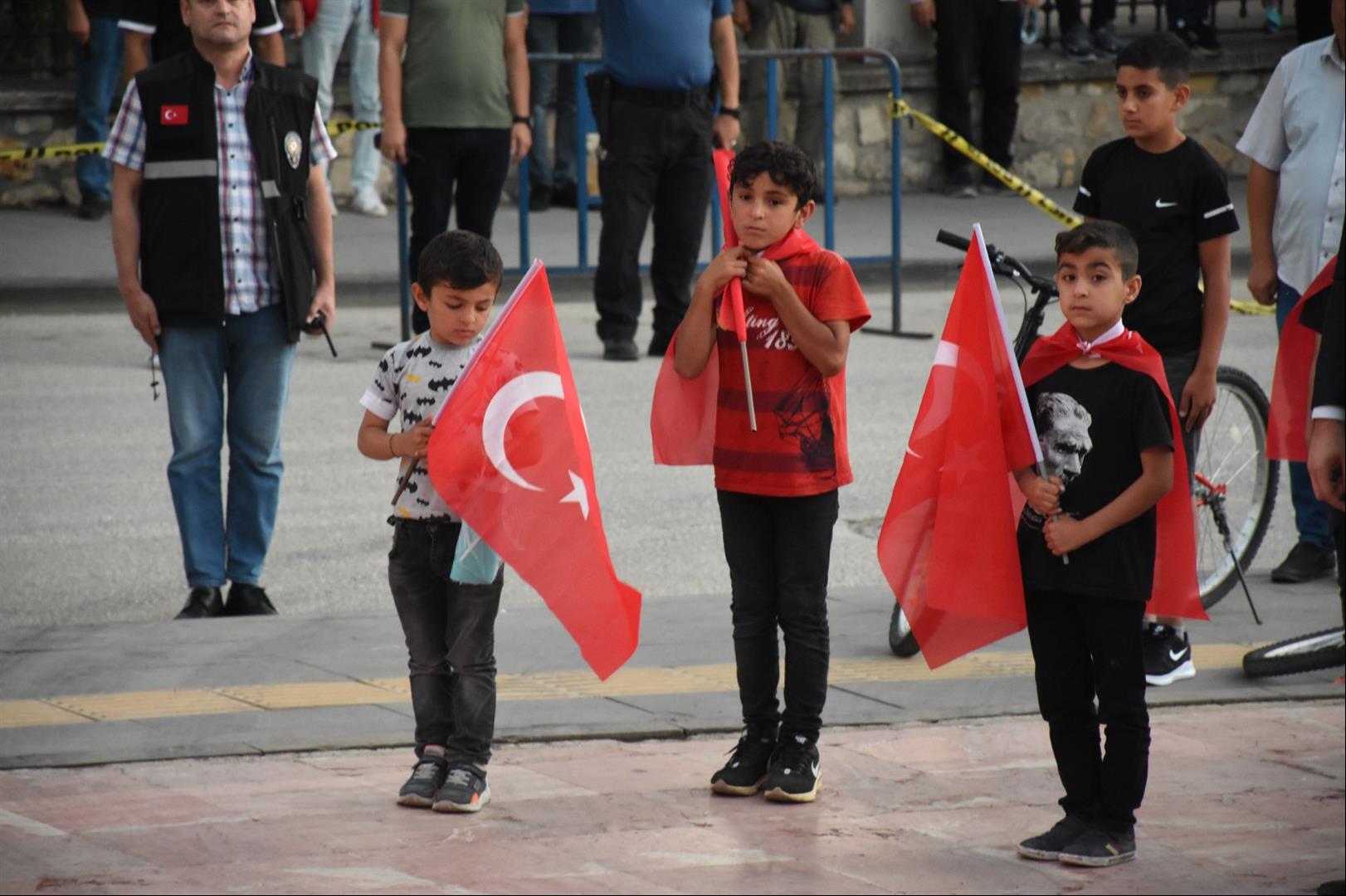 Cumhuriyet Meydanı’ndaki program, saygı duruşunda bulunulması, İstiklal Marşı’nın okunmasıyla başladı. Törende 15 Temmuz Demokrasi ve Milli Birlik Şehitleri Sancak Koşusuna katılan sporcular tarafından Vali Kemal Kızılkaya’ya Türk bayrağı teslim edildi. Kızılkaya, sporculara teşekkür belgesi takdim etti.