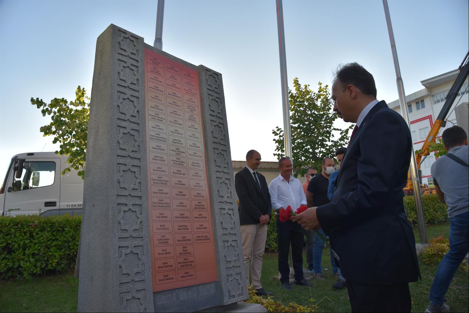 İstiklal Marşı’nın okunmasının ardından Vali Kemal Kızılkaya, Bilecik 2. Jandarma Eğitim Tugay Komutanı Tuğgeneral Vedat Çolak, Bilecik Cumhuriyet Başsavcı Vekili Ömer Ceceloğlu, Bilecik Belediye Başkan Yardımcısı Özgür Algın, İl Emniyet Müdürü Ertuğrul Namal, Bilecik Şeyh Edebali Üniversitesi Rektörü Prof. Dr. Şükrü Beydemir ve kurum temsilcileri, 15 Temmuz Şehitleri’nin isimlerinin bulunduğu bölüme karanfil bıraktı.