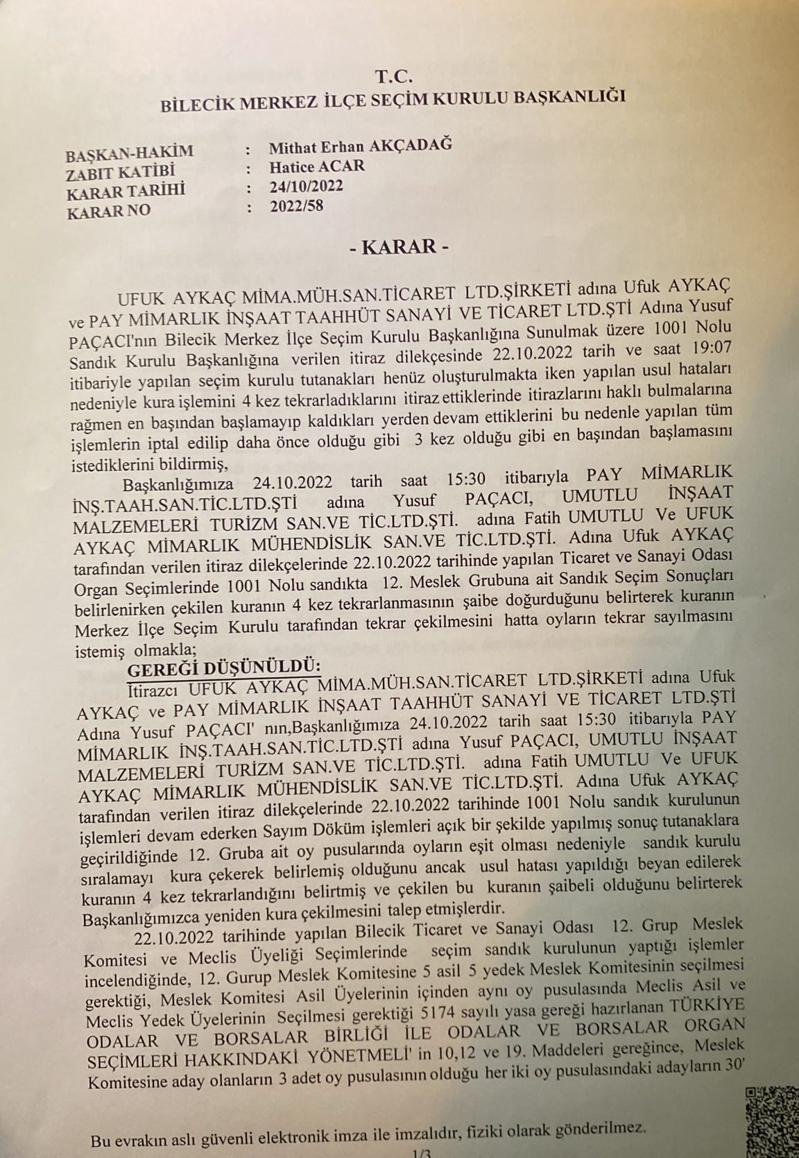 “Yusuf Paçacı, Fatih Umutlu, ve Ufuk Aykaç, tarafından verilen itiraz dilekçelerinde 22.10.2022 tarihinde 1001 nolu sandık kurulunun işlemleri devam ederken sandık döküm işlemleri açık bir şekilde yapılmış sonuç tutanaklara geçirildiğinde 12. gruba ait oy pusulalarında oyların eşit olması sebebiyle sandık kurulu sıralamayı kura çekerek belirlemiş olduğunu ancak usul hatası yapıldığı beyan edilerek kuranın 4 kez tekrarlandığını belirtmiş ve çekilen bu kuranın şaibeli olduğunu belirterek başkanlığımızca yeniden kura çekilmesini talep etmişlerdir.
