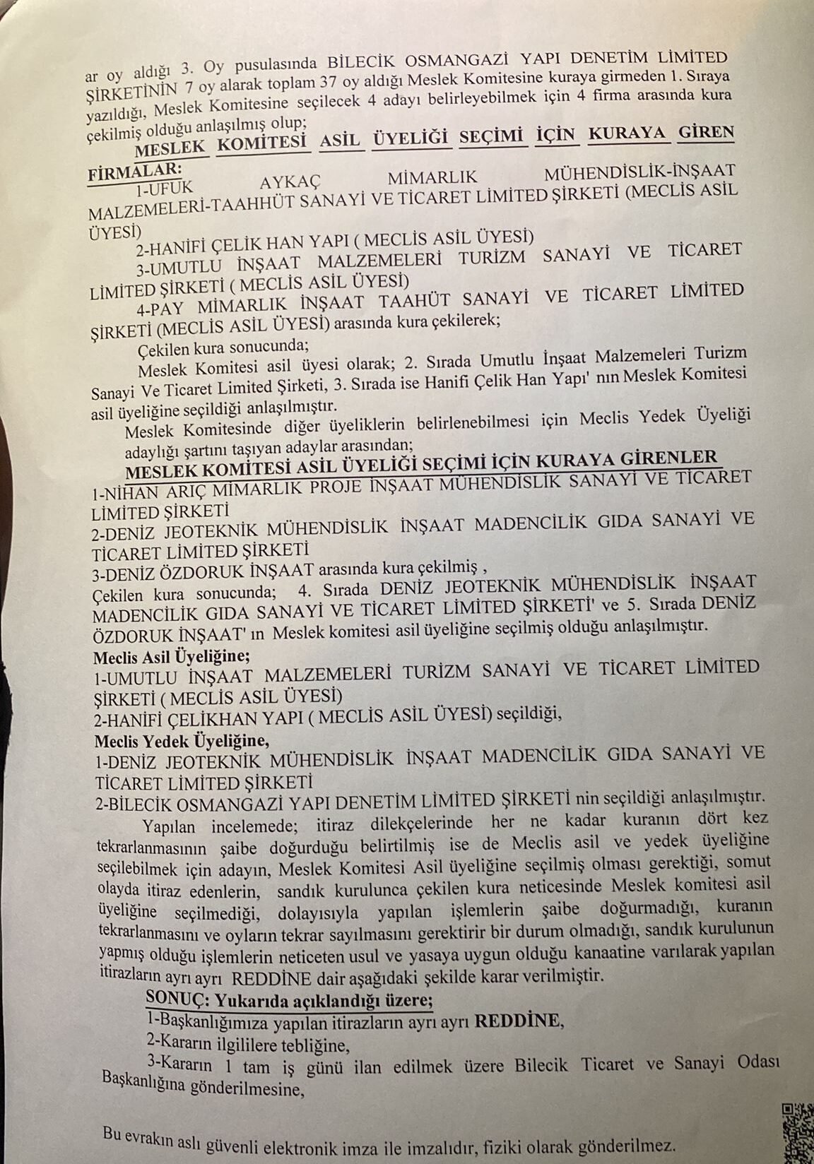 Meslek komitesi asil üyeliği seçimi için kuraya giren firmalar: Ufuk Aykaç Mimarlık – Mühendislik İnşaat ve İnşaat Malzemeleri Taahhüt Sanayi ve Ticaret Ltd. Şti. (MECLİS ASİL ÜYE), Deniz Jeoteknik Mühendislik İnşaat Madencilik Gıda Sanayi ve Ticaret Ltd. Şti. ile Deniz Öz Doruk İnşaat arasında kura çekilmiş, Çekilen kura sonucunda 4. sırada Deniz Jeoteknik Mühendislik İnşaat Madencilik Gıda Sanayi ve Ticaret Ltd. Şti. ve 5. sırada Deniz Öz Doruk İnşaat’ın meslek komitesi asil üyeliğine seçilmiş olduğu anlaşılmıştır.