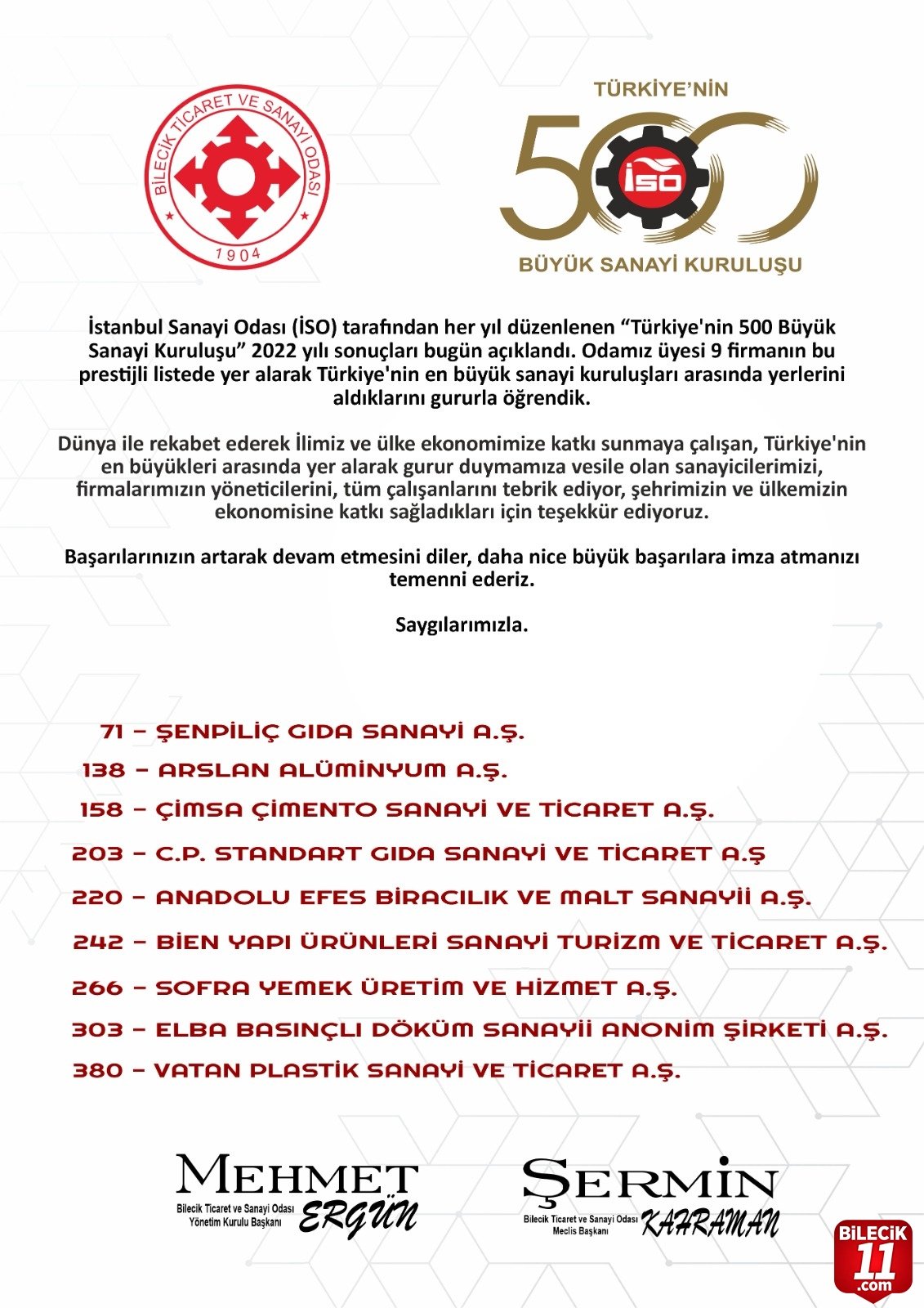 Bilecik Ticaret ve Sanayi Oda üyesi 9 firma da bu prestijli listede yer alarak Türkiye’nin en büyük sanayi kuruluşları arasında yerlerini aldı.
