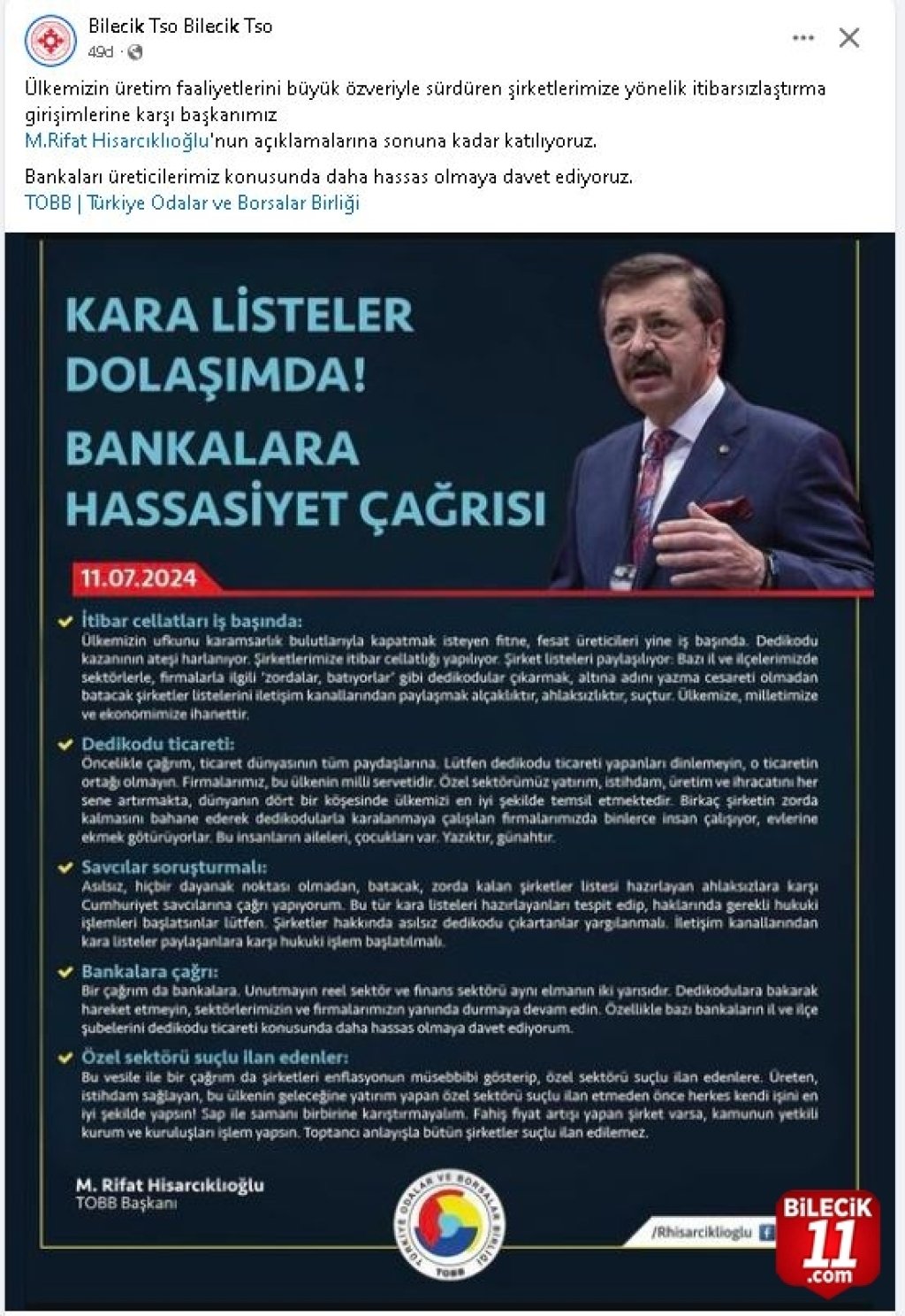 Bilecik Ticaret ve Sanayi Odası tarafından TOBB Başkanı Rifat Hisarcıklıoğlu’nun, “Kara listeler dolaşımda!,Bankalara hassasiyet çağrısı”na destek geldi. Bilecik TSO’nun sosyal medya hesabından yapılan paylaşımda, “Ülkemizin üretim faaliyetlerini büyük özveriyle sürdüren şirketlerimize yönelik itibarsızlaştırma girişimlerine karşı başkanımız M.Rifat Hisarcıklıoğlu’nun açıklamalarına sonuna kadar katılıyoruz. Bankaları üreticilerimiz konusunda daha hassas olmaya davet ediyoruz.” denildi.
