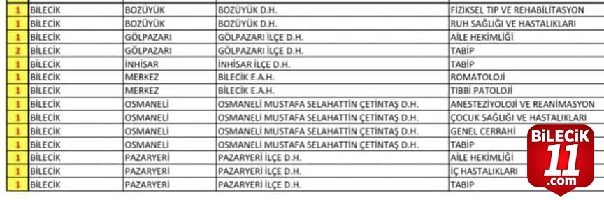 İlçeler bazında bakıldığında ise; Bozüyük Devlet Hastanesi’ne; 1 Fiziksel Tıp ve Rehabilitasyon, 1 Ruh Sağlığı ve Hastalıkları, Gölpazarı İlçe Devlet Hastanesi’ne; 1 Aile Hekimliği, 1 Tabip, İnhisar İlçe Devlet Hastanesi’ne; 1 Tabip, Osmaneli Mustafa Selahattin Çetintaş Devlet Hastanesi’ne; 1 Anesteziyoloji ve Reanimasyon, 1 Çocuk Sağlığı ve Hastalıkları, 1 Genel Cerrah, 1 Tabip, Pazaryeri İlçe Devlet Hastanesi’ne; 1 Aile Hekimi, 1 İç Hastalıkları, 1 Tabip ataması yapıldı.