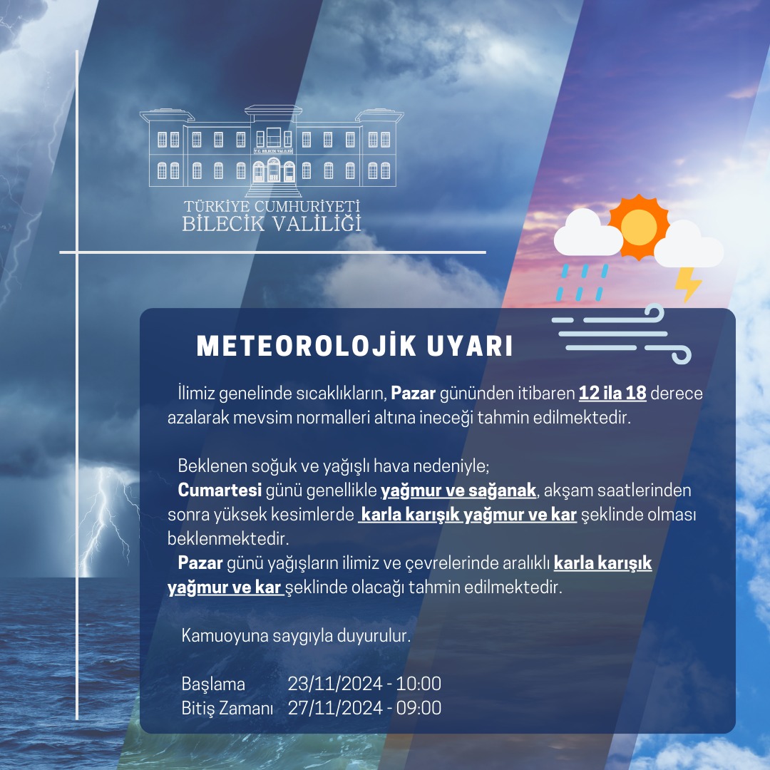 Bilecik Valiliği’nden yapılan açıklamada hava sıcaklıklarının 18 derece düşeceği Bilecik’te pazar günü kar yağışı beklendiği bildirildi.