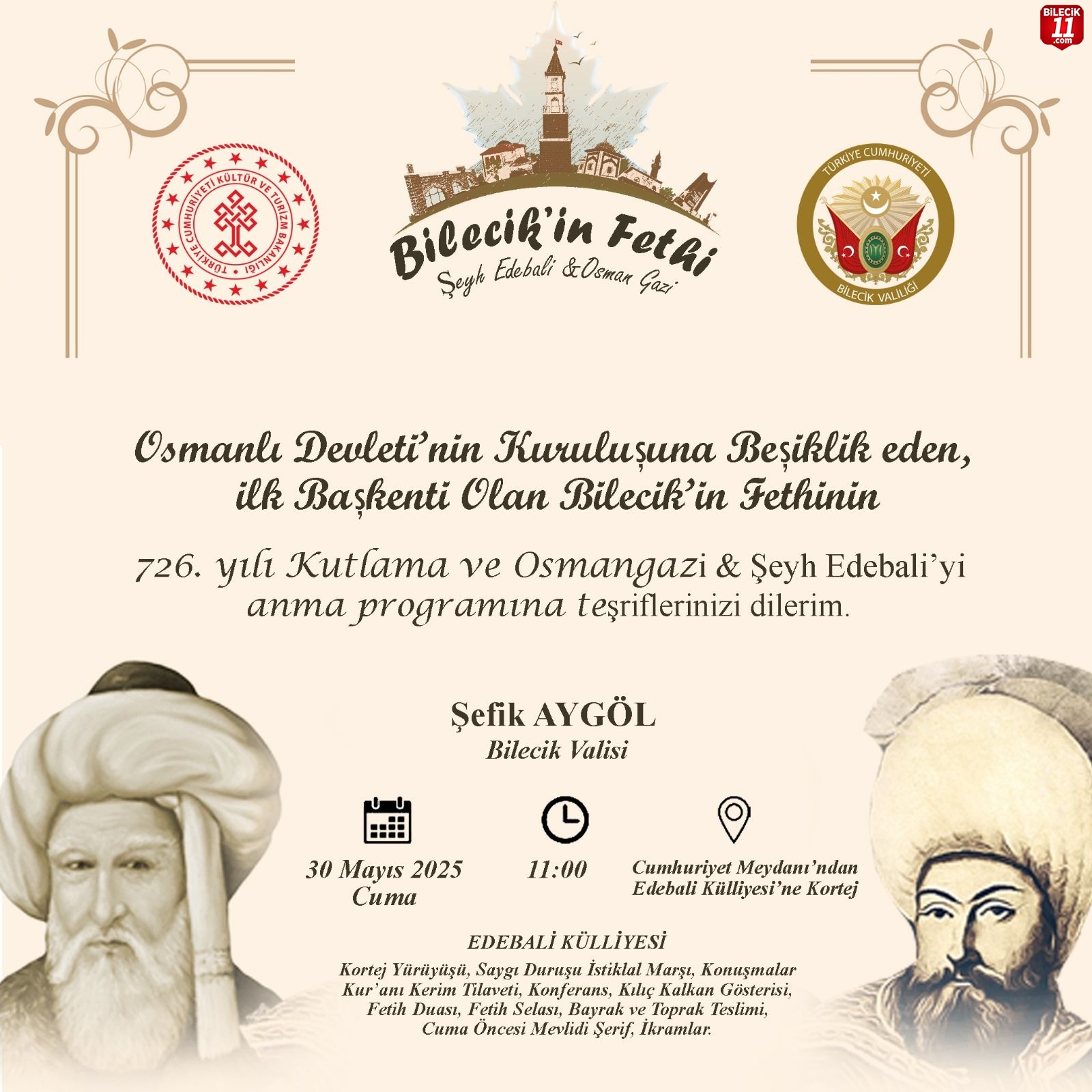 Bilecik Valiliği himayesinde İl Kültür ve Turizm Müdürlüğü koordinasyonunda, şehrimizin ve Devlet-i Aliyye Osmanlı’nın, tarihindeki dönüm noktalarından biri olan Bilecik’in Fethi’nin 726. yıl dönümünü büyük bir coşku ve saygıyla kutlamacak. Aynı zamanda, Osmanlı Devleti’nin kurucusu Gazi Osman Bey ve manevi rehberi Şeyh Edebali Hazretleri’ni de bu anlamlı günde rahmet ve minnetle anılacak.