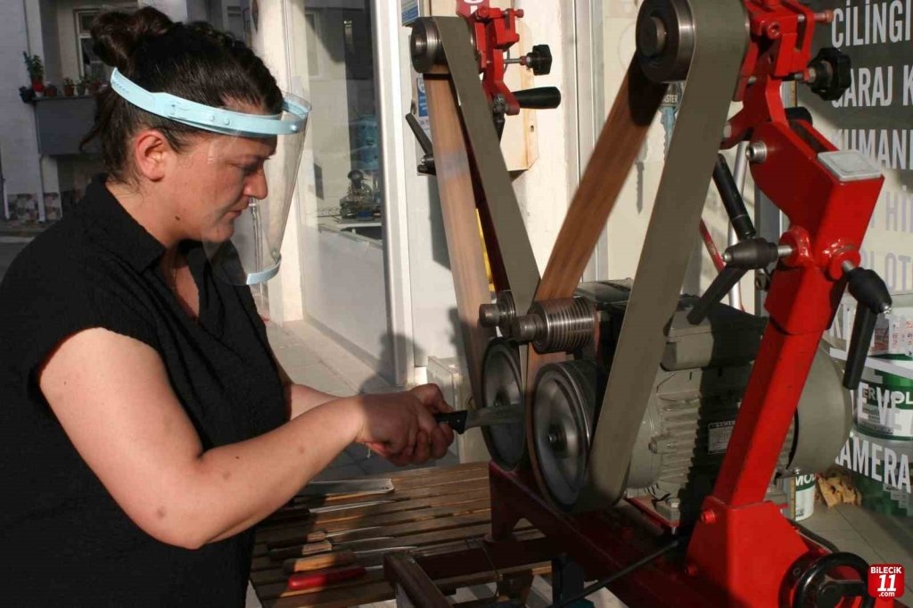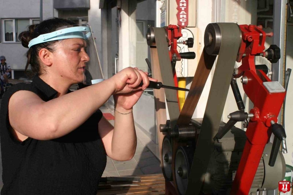 Bilecik’in Bozüyük ilçesinde bıçak bileme işi yapan Meltem Çelik’i görenler şaşkınlık yaşarken Çelik işini en iyi şekilde yapıyor.