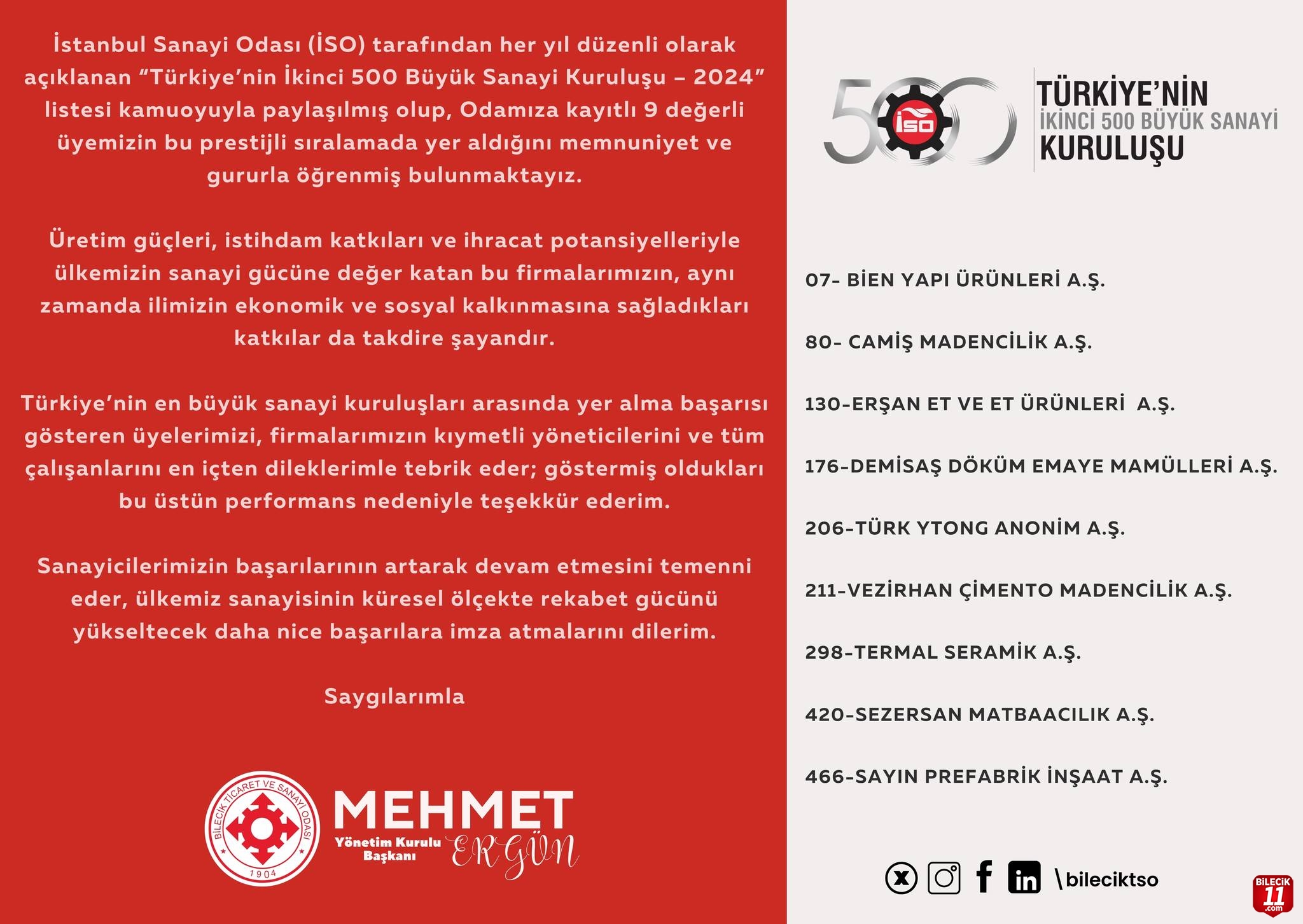 İstanbul Sanayi Odası (İSO) tarafından her yıl düzenli olarak açıklanan “Türkiye’nin İkinci 500 Büyük Sanayi Kuruluşu – 2024” listesi açıklandı. Bilecik Ticaret ve Sanayi Odası’na (TSO) kayıtlı 9 firmanın listede yer alması ile guru yaşandı.