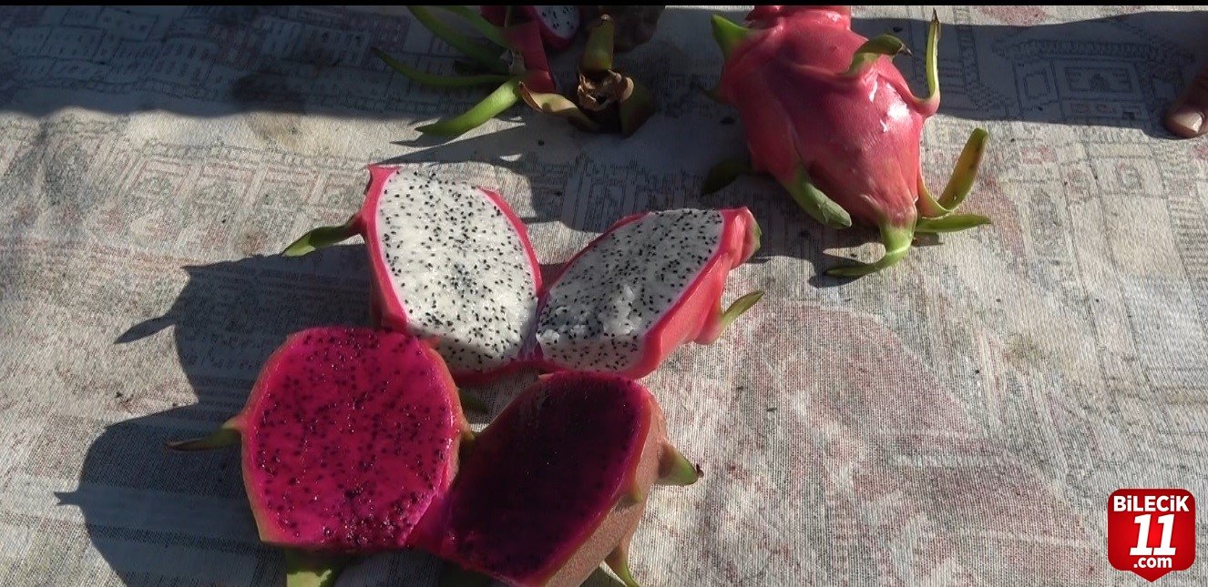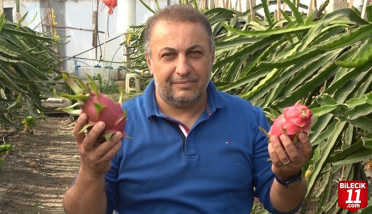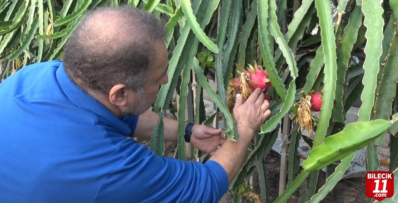 Bilecik’te internette görüp etkilendiği ejder meyvesini evinin bahçesinde tek bir fideyle yetiştirmeye başlayan berber Mehmet Kılıç şimdi 210 metrekare serasında seri üretime geçti.
