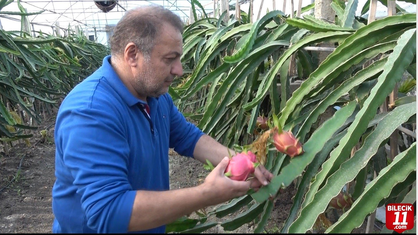 Bilecik’in Bayırköy Beldesinde kaktüsgiller familyasına ait bir meyve olan ve ’pitaya’ ismiyle de bilinir ejder meyvesi üretimi yapan Mehmet Kılıç bu işe bir fide ile hobi olarak aşladığını söyledi.
