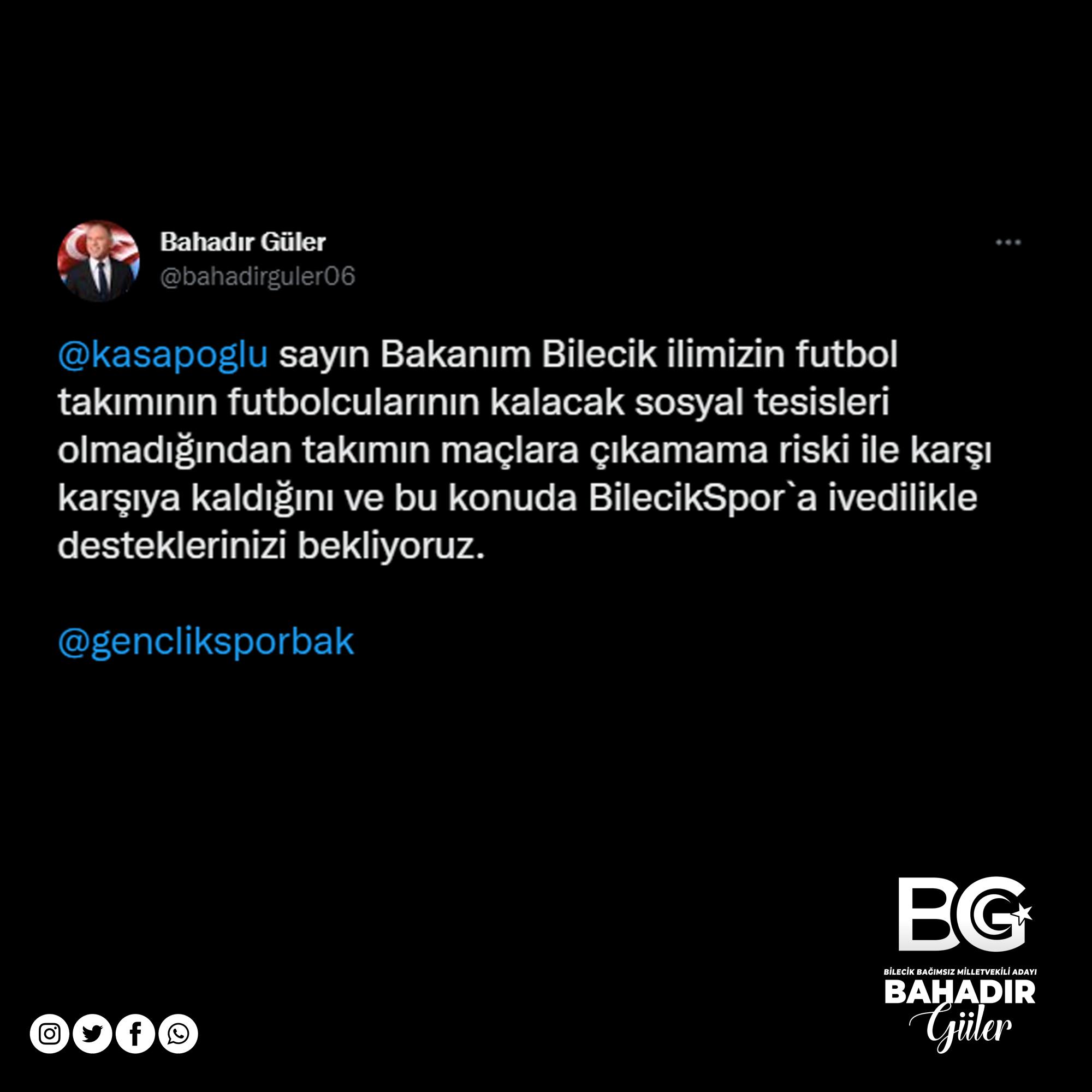 Gençlik ve Spor Bakanı Mehmet Kasapoğlu’ndan da konuyla ilgili destek isteyen Bahadır Güler, Twitter üzerinden yaptığı ve bakan Kasapoğlu’nu etiketlediği paylaşımda “Sayın bakanım Bilecik ilimizin futbol takımının futbolcularının kalacak sosyal tesisleri olmadığından takımın maçlara çıkamama riski ile karşı karşıya kaldığını ve bu konuda Bilecikspor’a ivedilikle desteklerinizi bekliyoruz.” ifadelerine yer verdi.